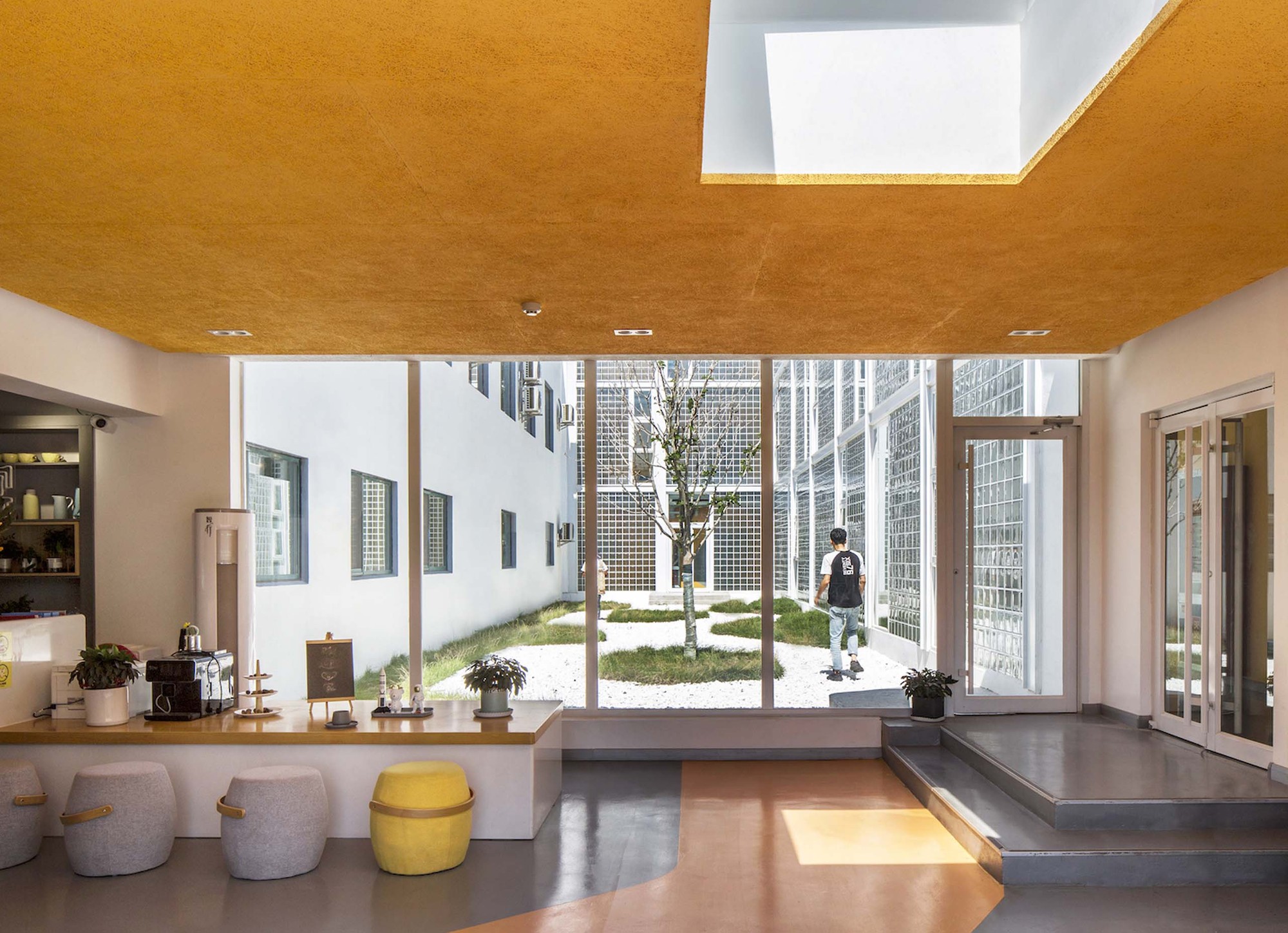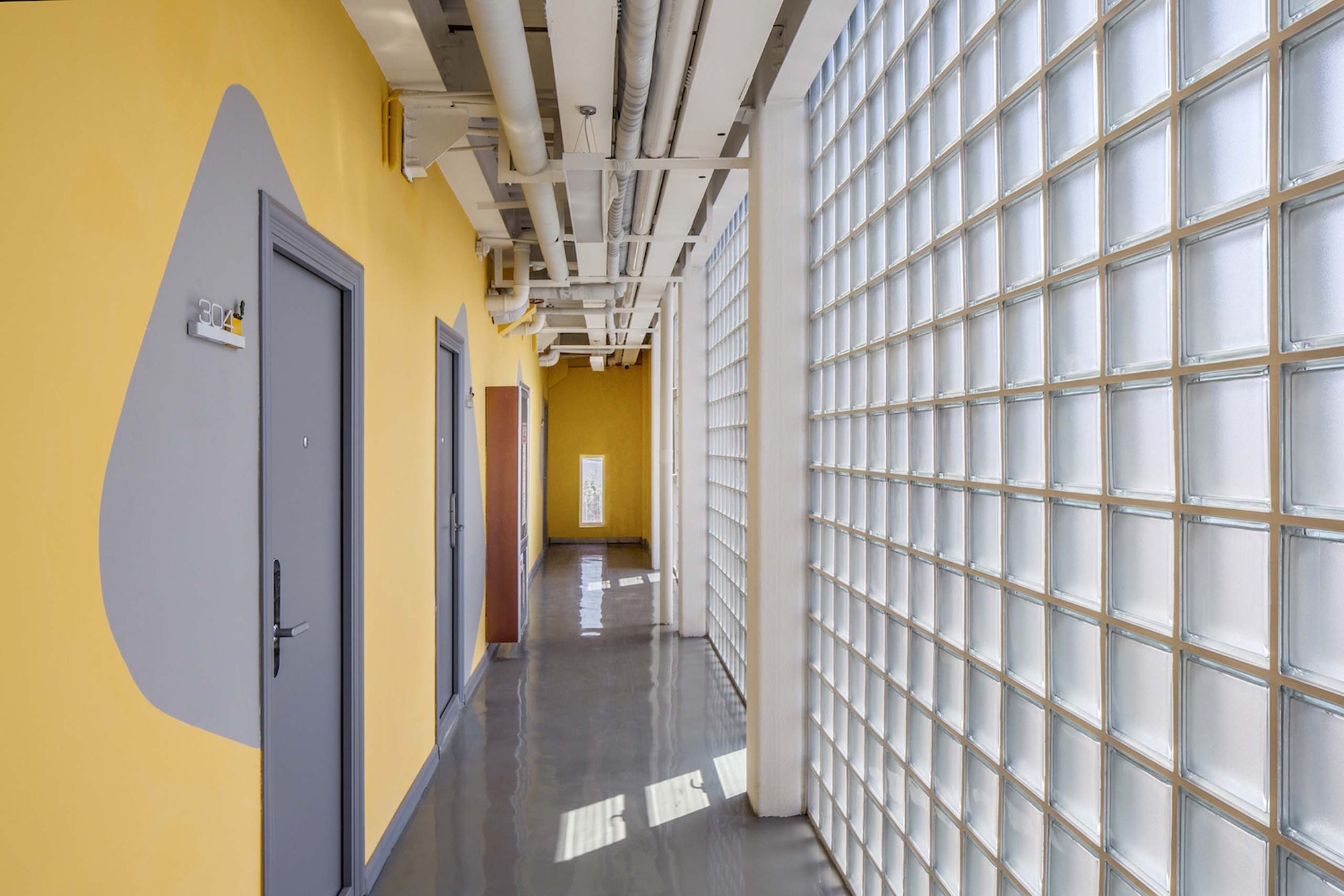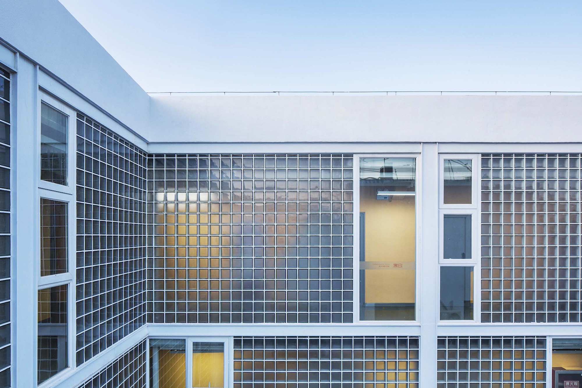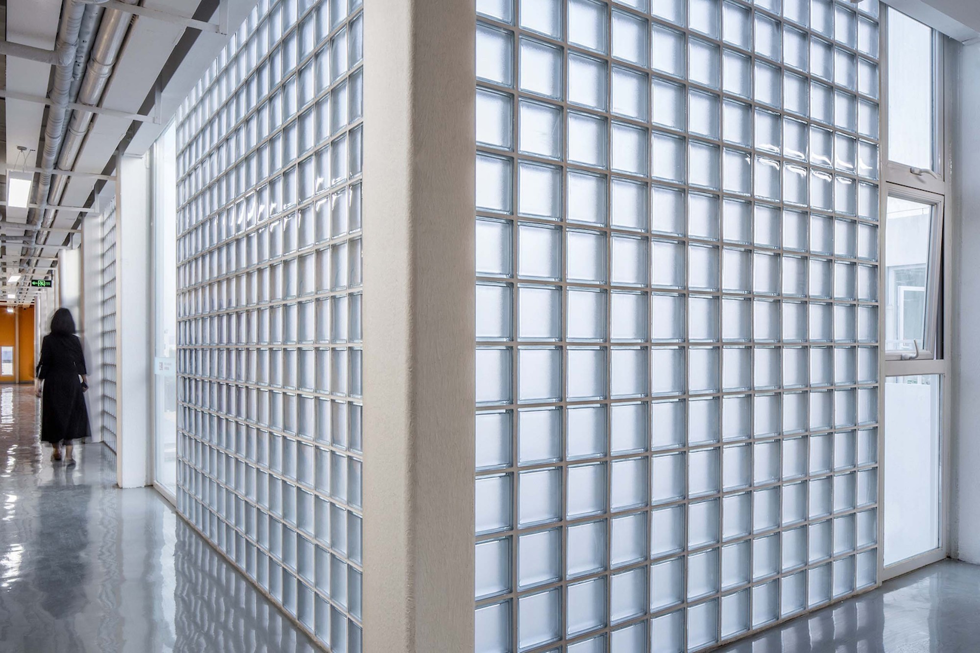 The added corridor faces to the quiet inner courtyard, and the façade material is mainly a translucent 200mm-wide square glass brick. During the daytime, the soft light shines into the corridor through the glass bricks, and refracting the shadows of people moving; at night, the orange walls on the corridor and other public space are illuminated by artificial lighting, and the faint goose-yellow permeates into the outside, like overflowing orange juice, bringing young people a home-like warm feeling.