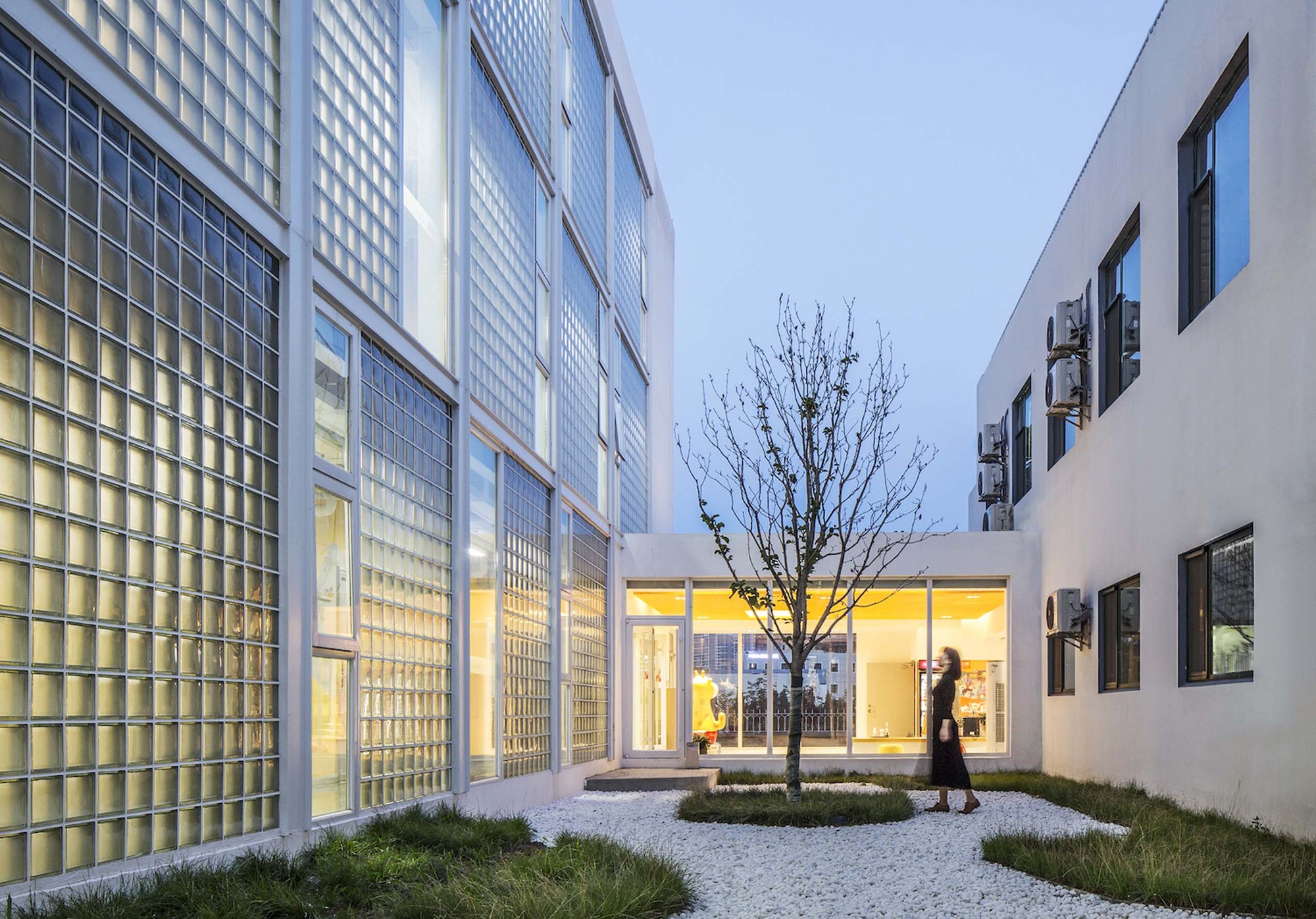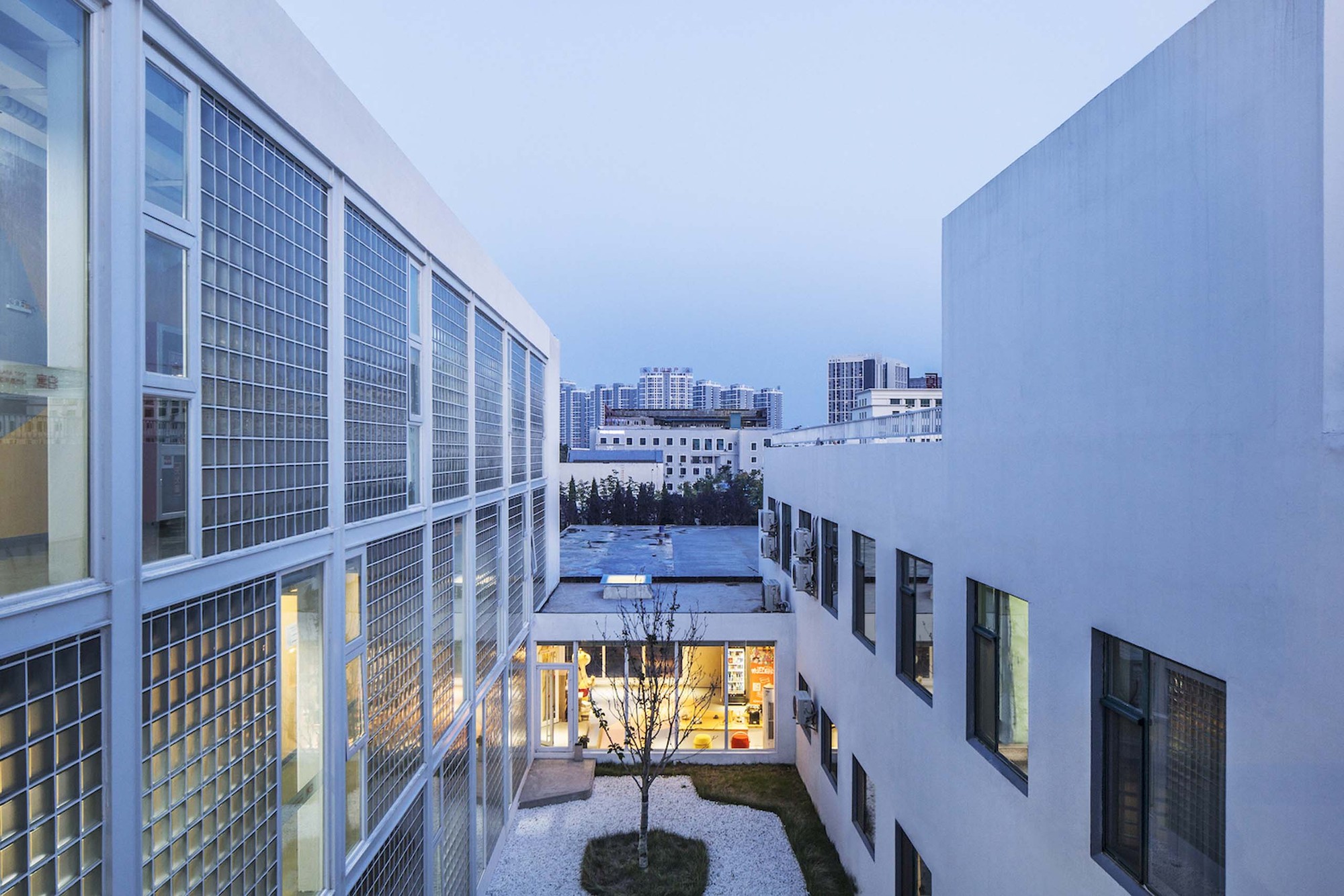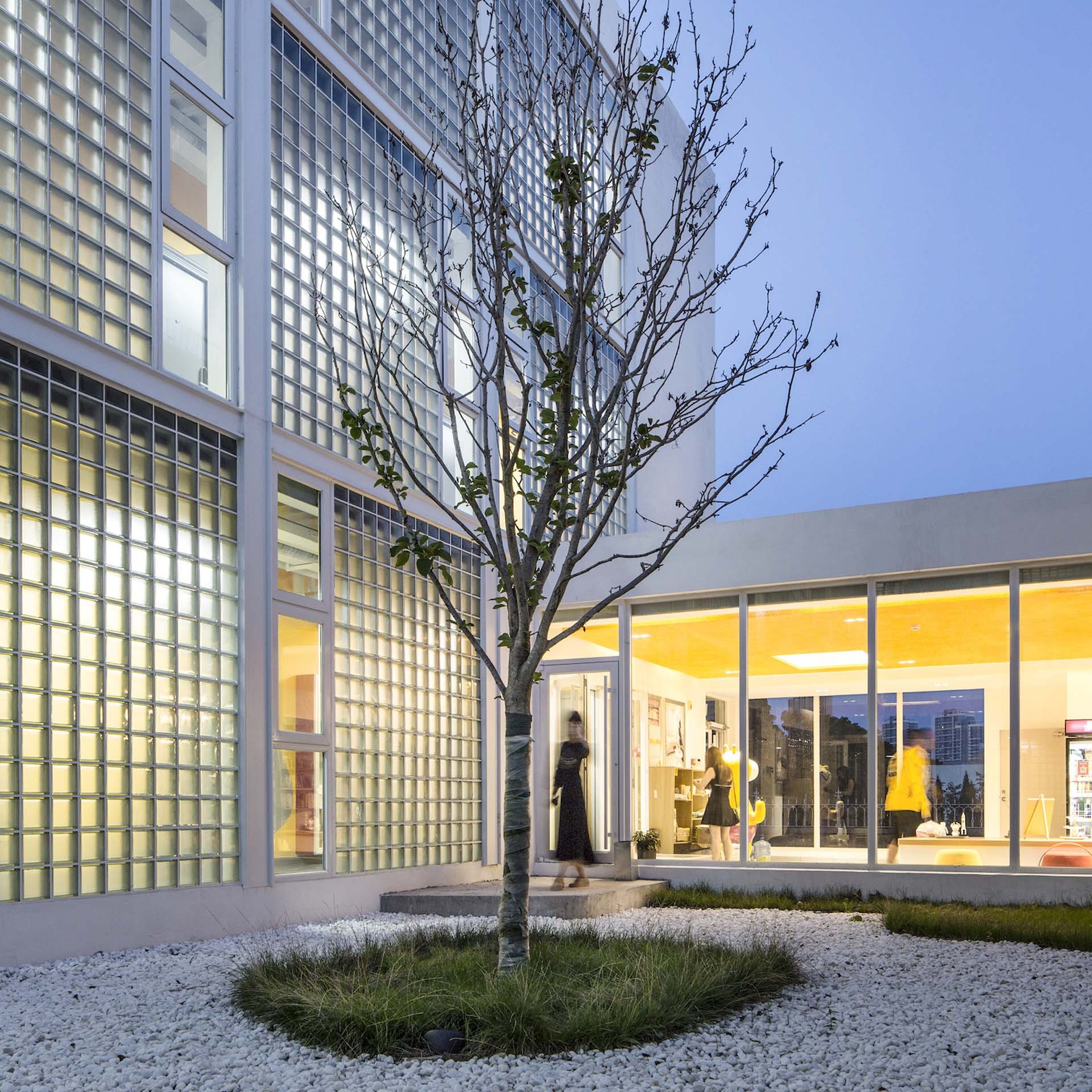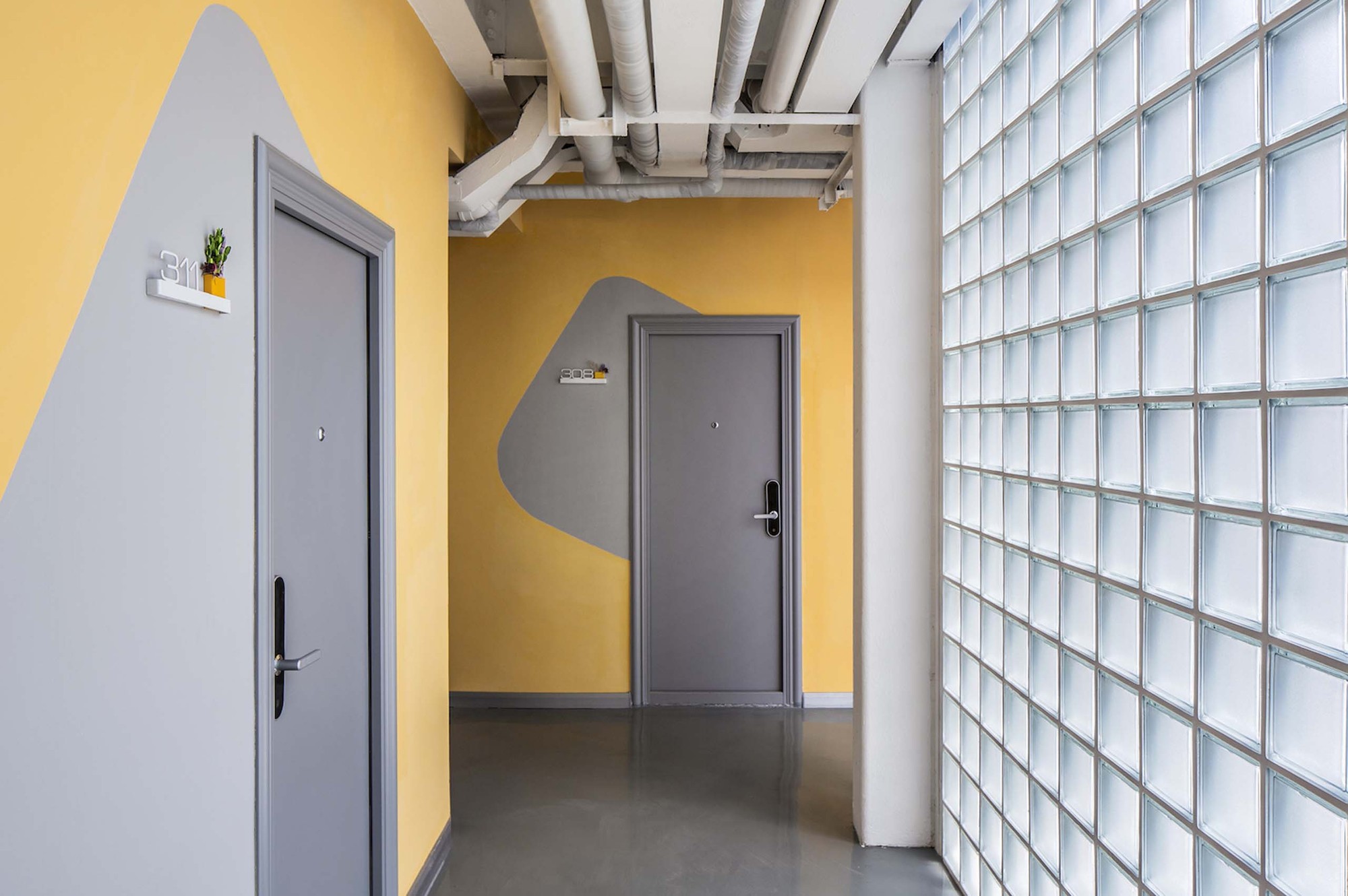 The added corridor faces to the quiet inner courtyard, and the façade material is mainly a translucent 200mm-wide square glass brick. During the daytime, the soft light shines into the corridor through the glass bricks, and refracting the shadows of people moving; at night, the orange walls on the corridor and other public space are illuminated by artificial lighting, and the faint goose-yellow permeates into the outside, like overflowing orange juice, bringing young people a home-like warm feeling.