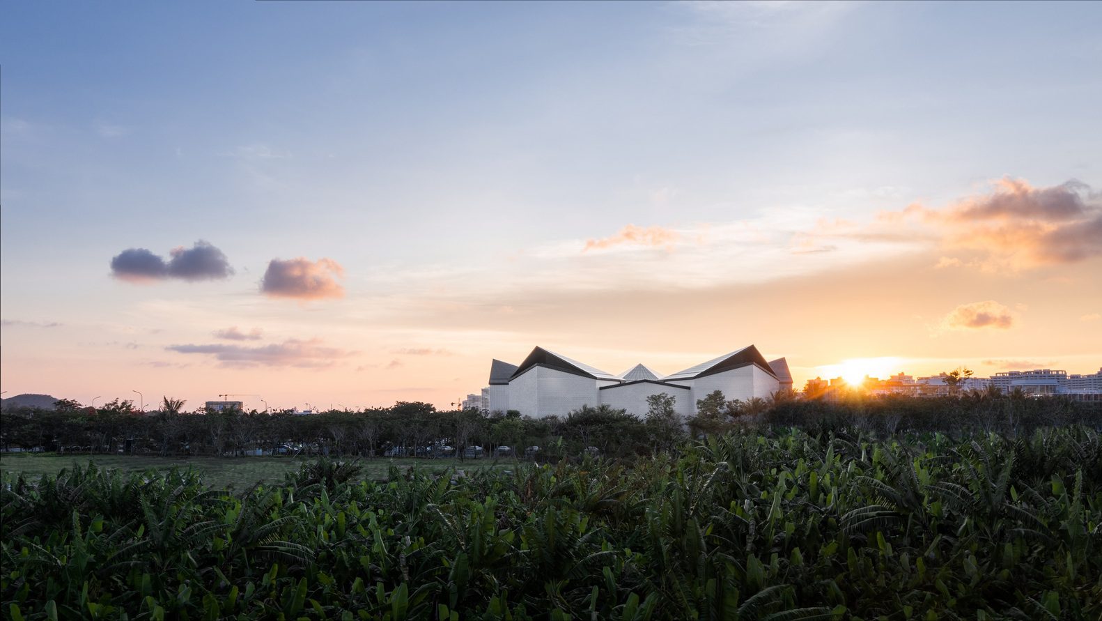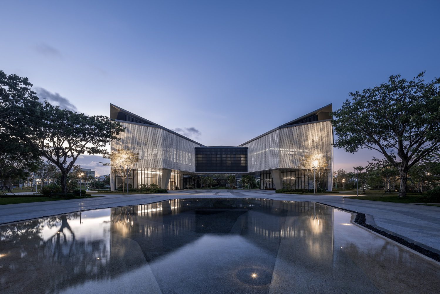 Ecological Habitat. The vicinity is filled with indigenous plants embedding the building in a lush garden. Shading and colling in its most natural form. The mild and warm climate of Sanya creates an opportunity for natural ventilation. The project manages to reduce the cooling loads by utilizing this feature. Openings on the pitched roofs allow the free flow of air. Aluminum-made façade panel features a hollowed-out pattern, which not only creates dynamic lighting inside the building but also provides sufficient shading for the adjacent spaces. Flexibility in the glass walls behind the façade to open up makes the whole building fully permeable, further reducing the operational carbon footprint.