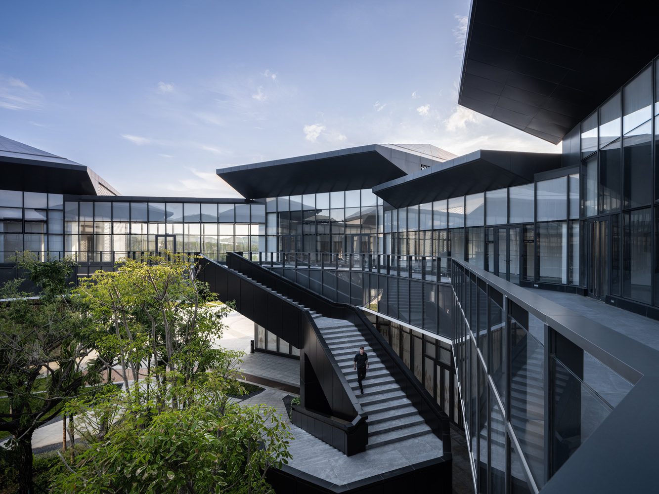 The building design is inspired by Hainan’s natural and cultural elements to create an authentic presence. The building form references the indigenous hut island architecture and floats like an island within the fluid natural landscape. Five major volumes featuring pitched roofs are connected through elevated corridor bridges, creating a spacious courtyard with minimal impact on the ground plane. A rising staircase from the central courtyard connects the two floors of the building.