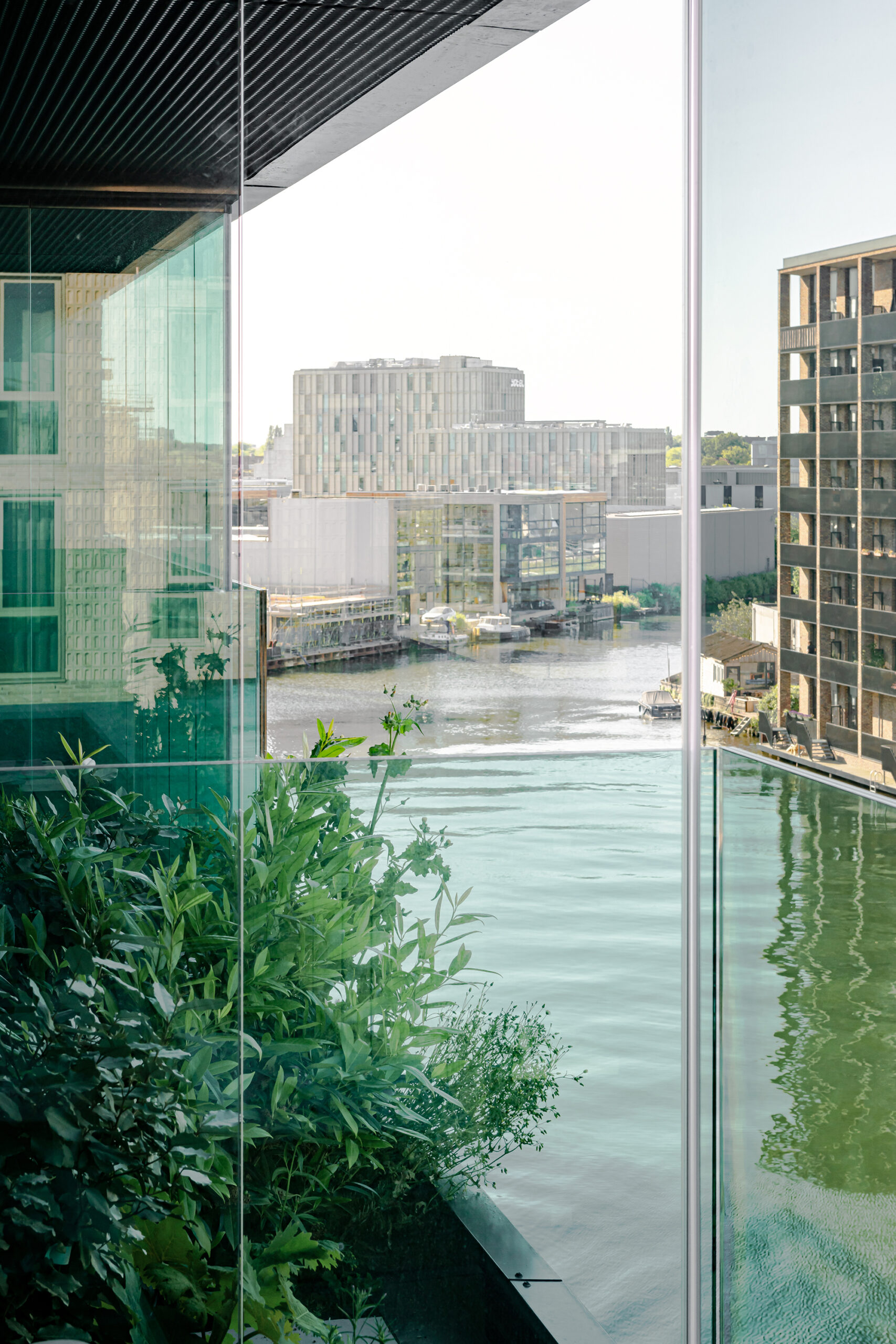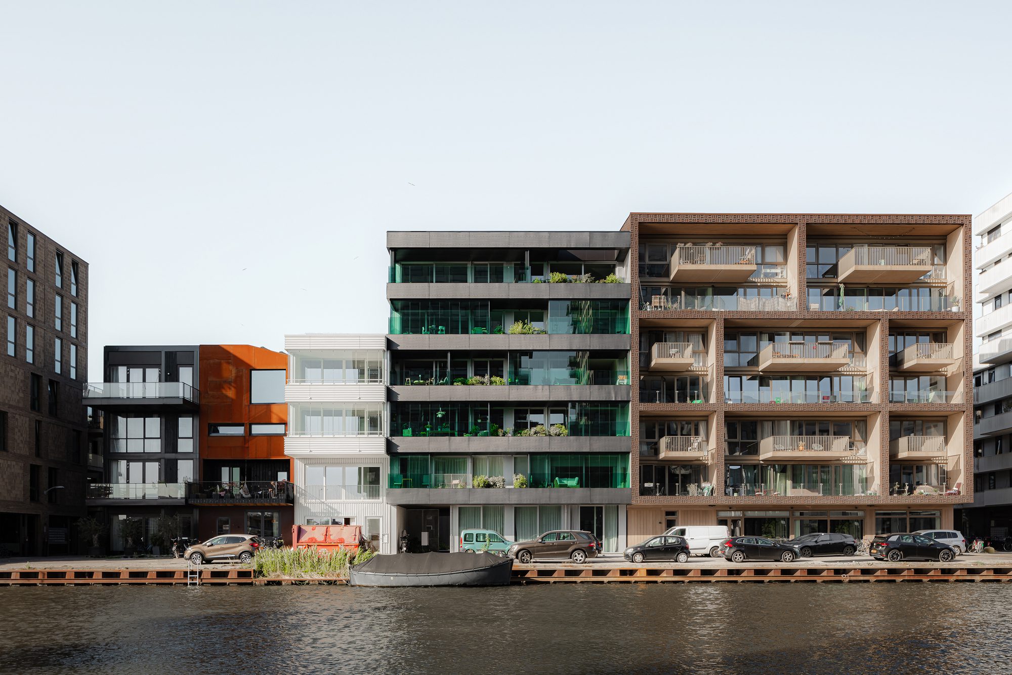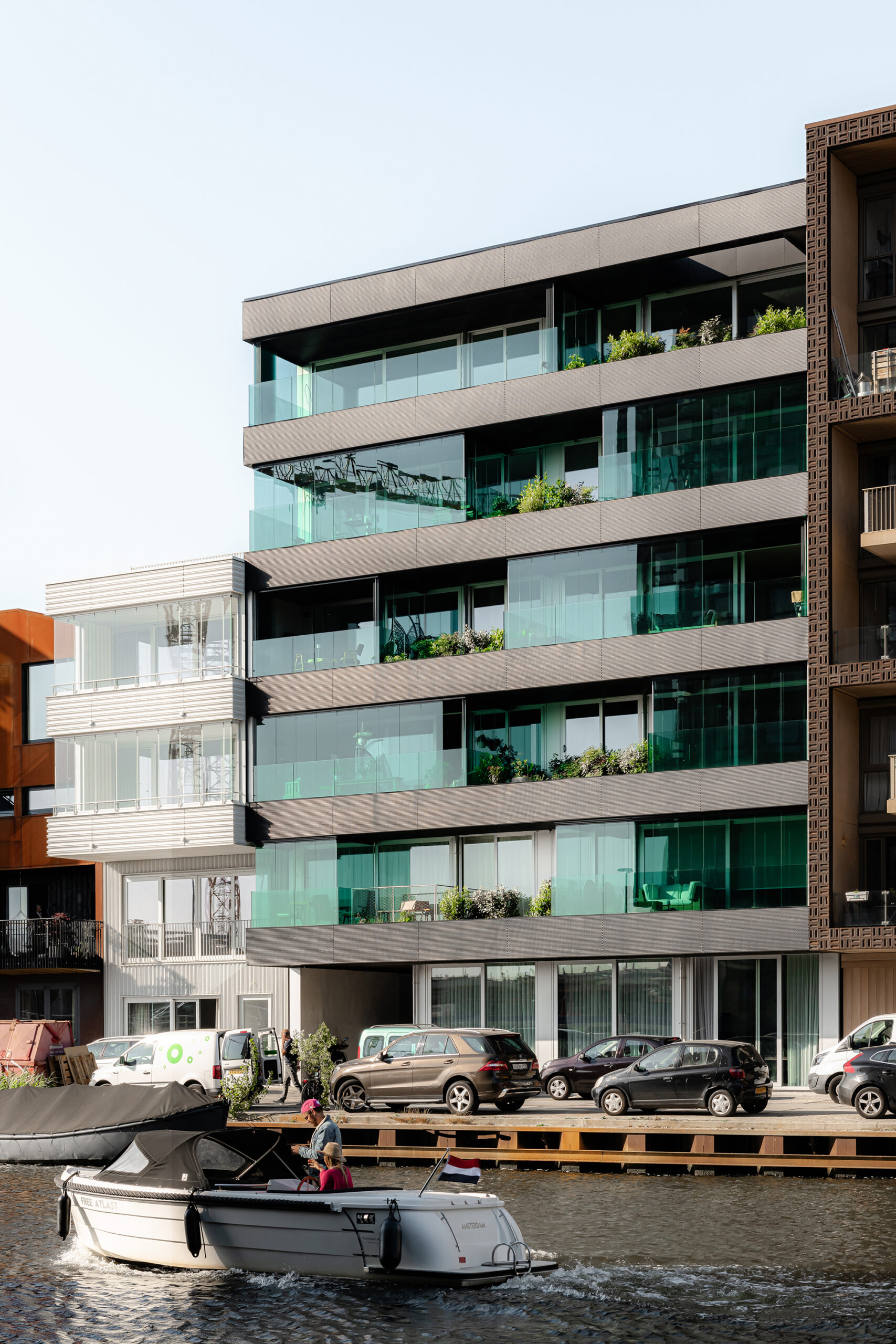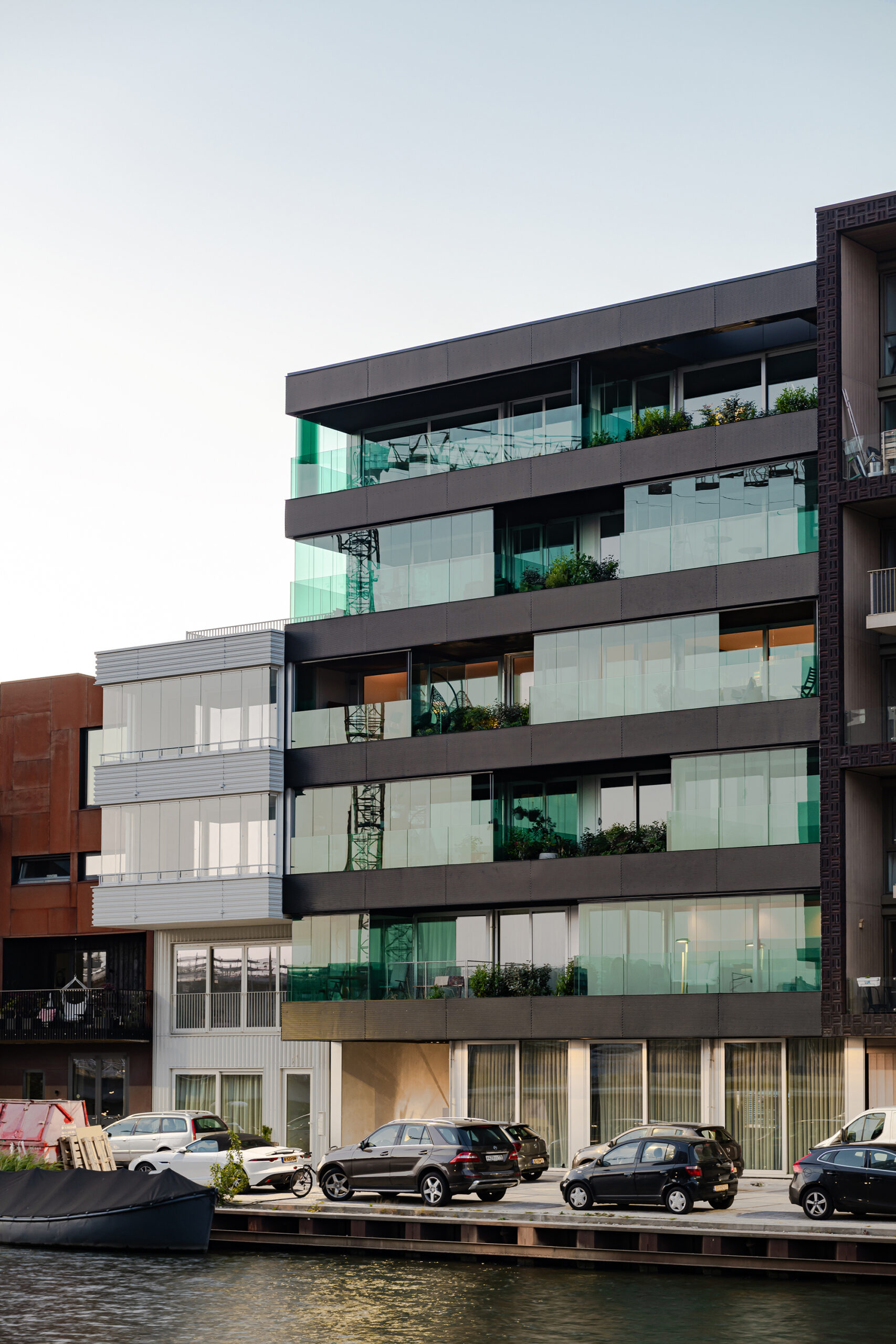 The five-story building accommodates 12 apartments and a communal green courtyard with bicycle storage on the ground floor. As the plot benefits from a waterfront location and sunny orientation, YCON’s green appearance will become increasingly lush for years to come. The dynamic facade and the materials suited to the industrial context of the area make YCON an architectural icon in Amsterdam Buiksloterham.