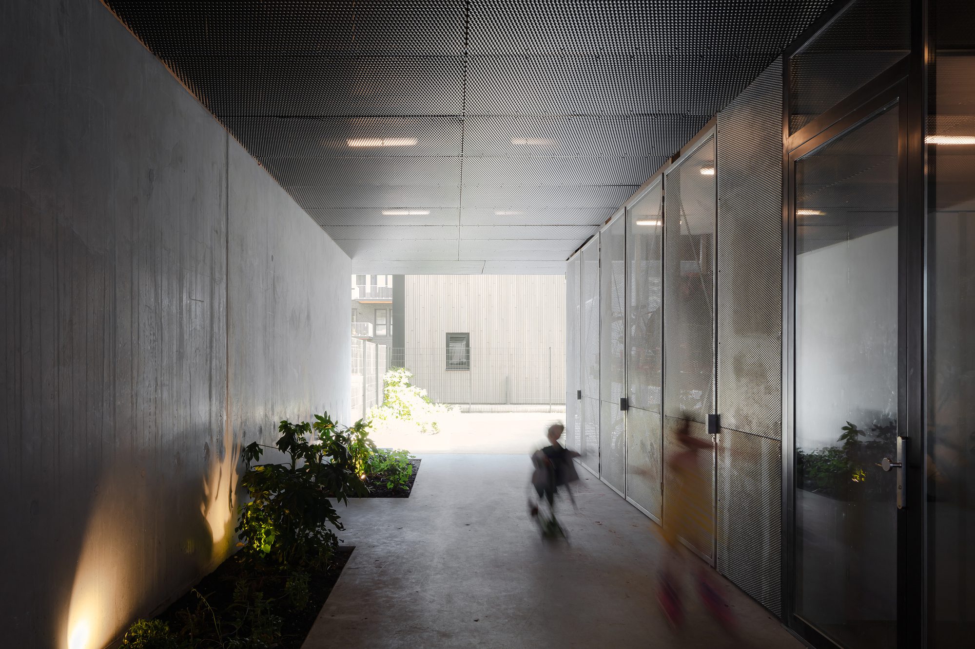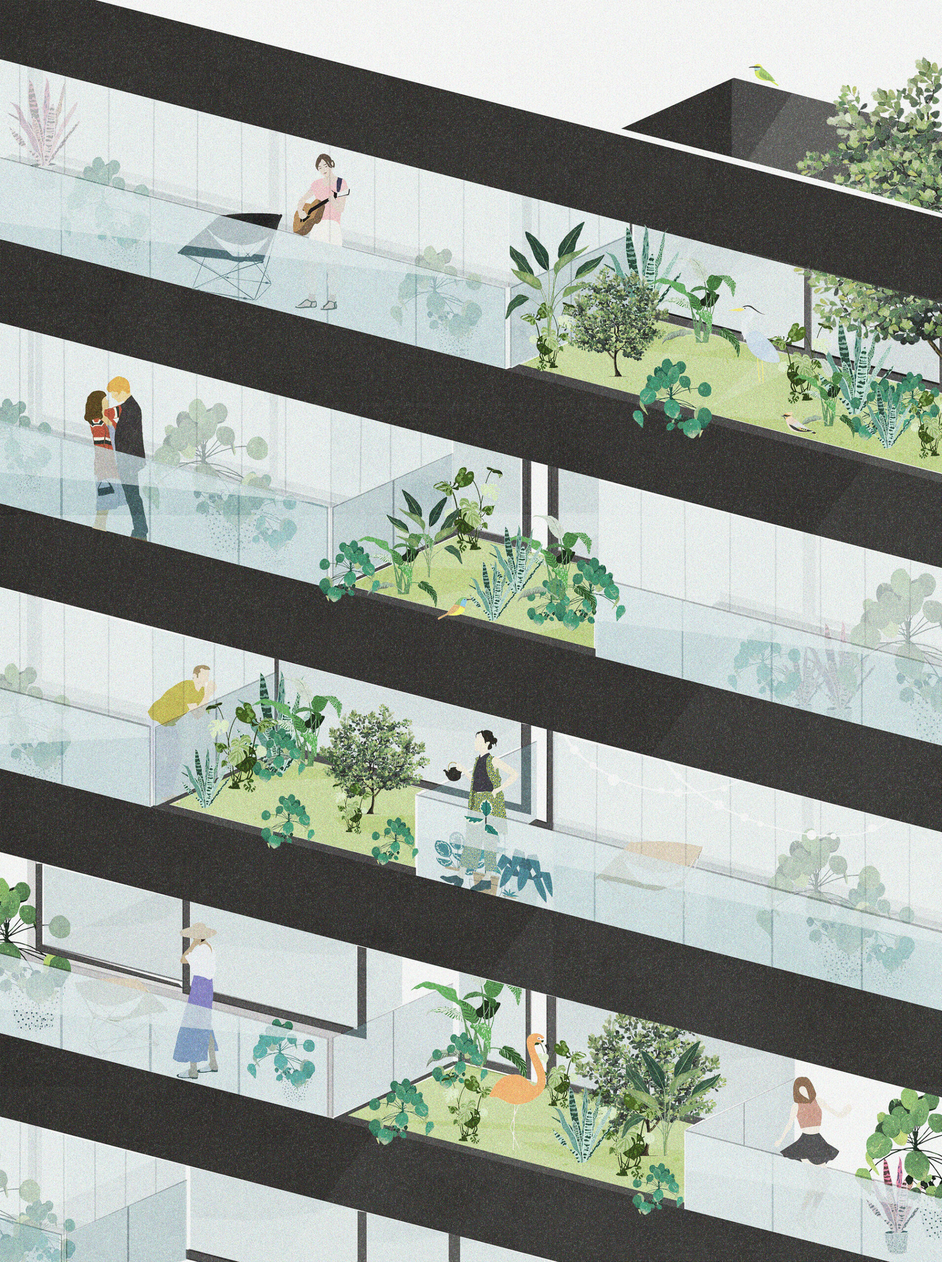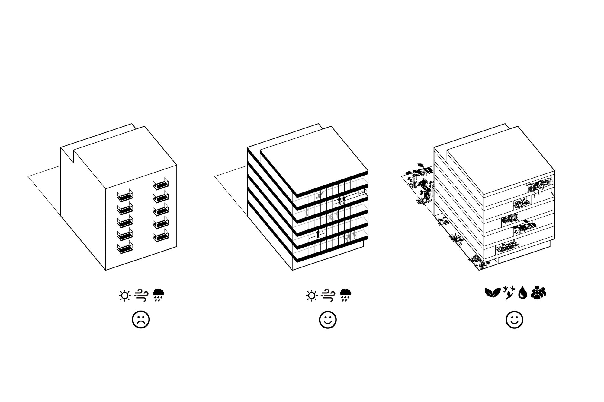 The building’s structure is made with prefabricated, demountable concrete elements, so it could possibly be dismantled and reused in the future. To support the facade gardens, the structure integrates a thick, sunken layer of soil sufficient to grow a variety of native plants, shrubs, flowers, and vegetables. Through the roof, rainwater is collected, stored, and reused for garden irrigation, reducing the pressure of excess rainwater on the sewage system.