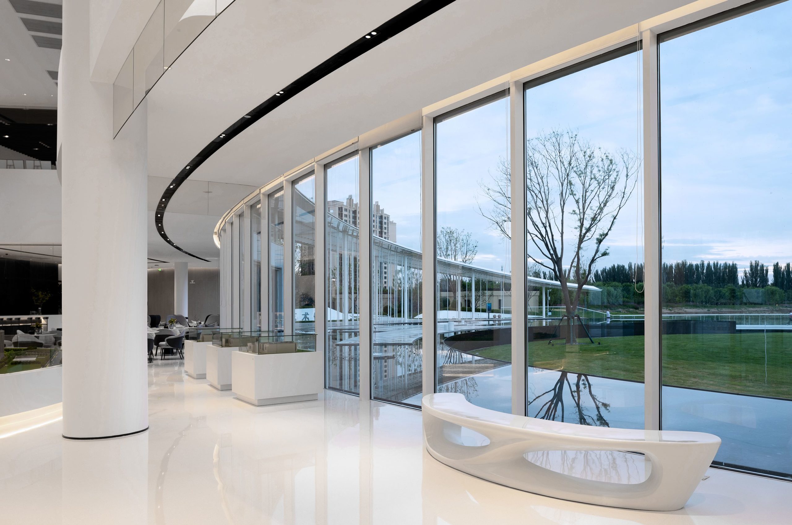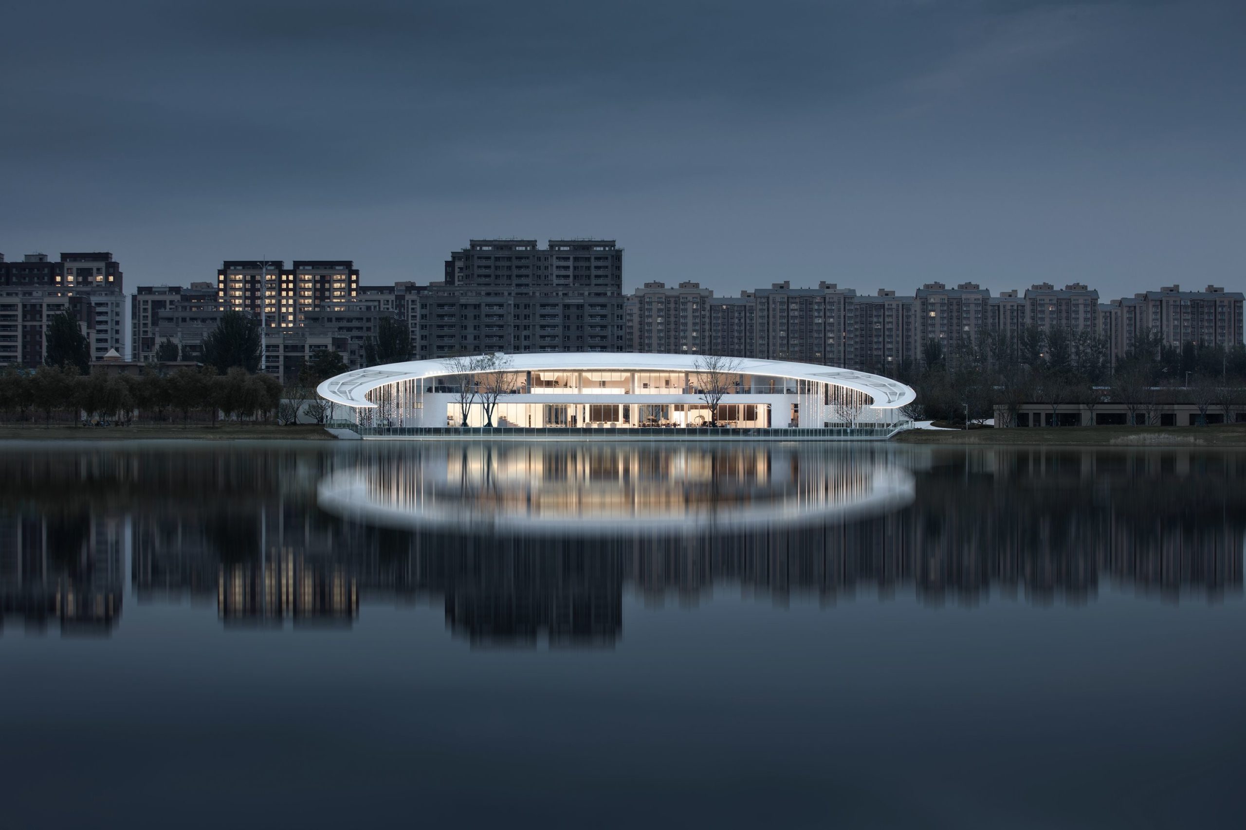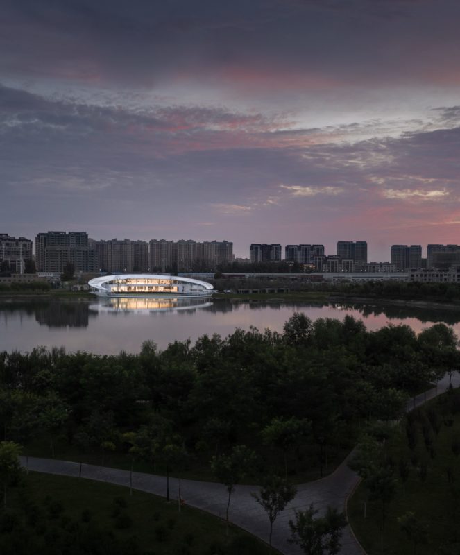 The internal area is organized around the curving wall. Irregular, high, and low interwoven arc-shaped walls support the entire building while connecting and dividing various functional rooms, expanding the layers of space and increasing spatial diversity. The translucent glass curtain wall opposite the lake allows visitors to detect seasonal changes. It blurs the line between the building and its environment, allowing them to engage with nature more effectively.
