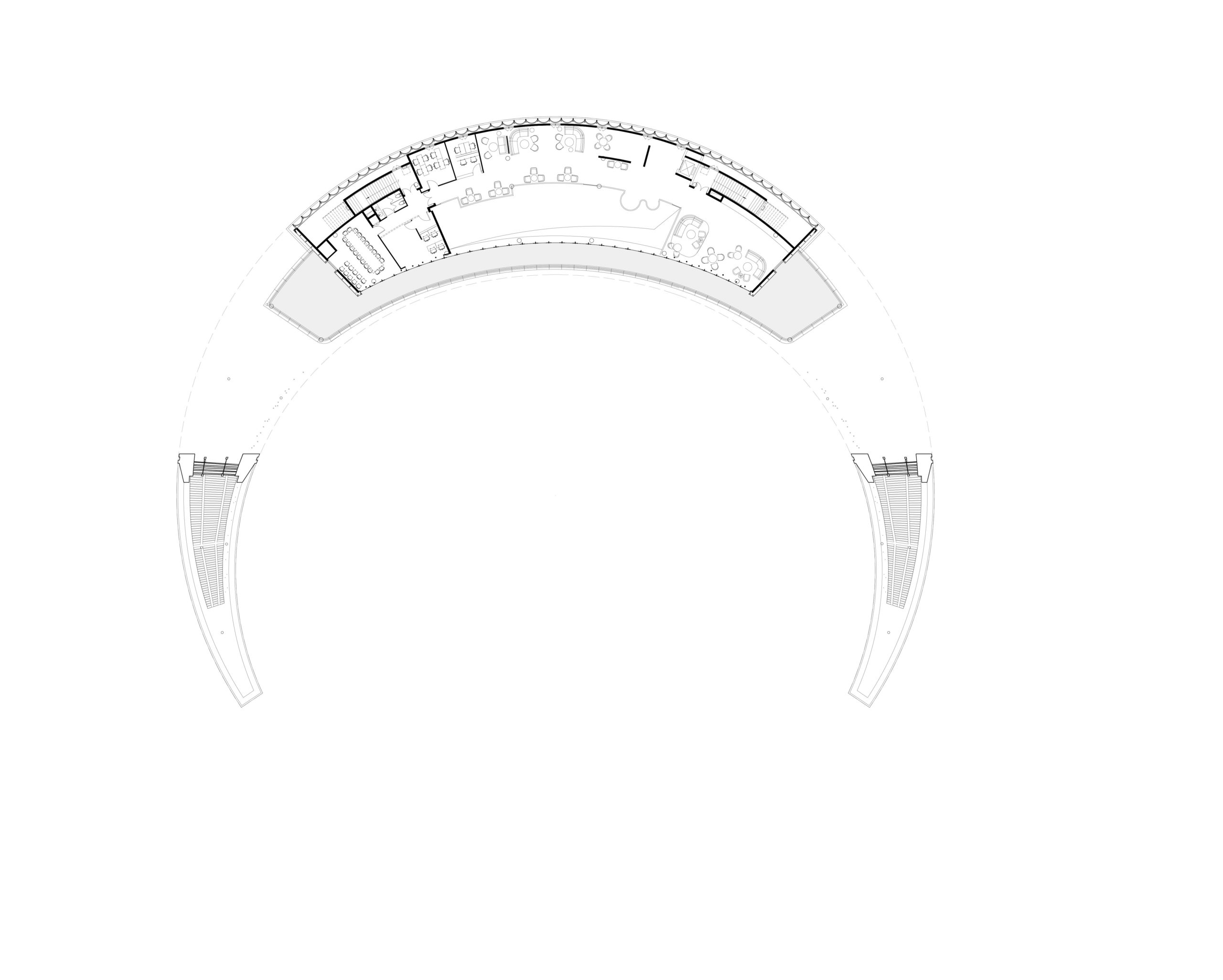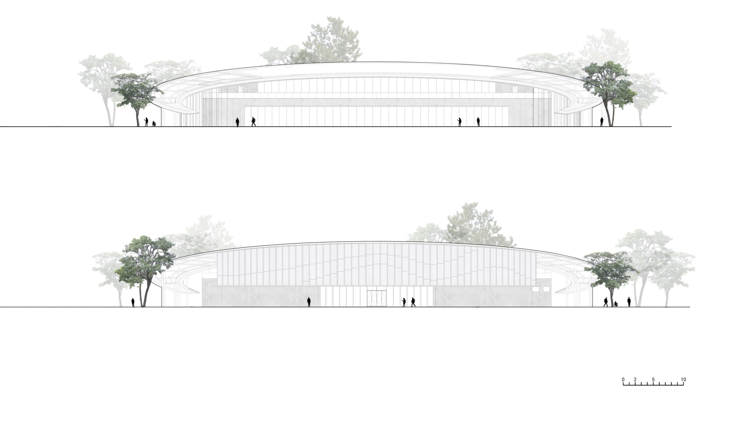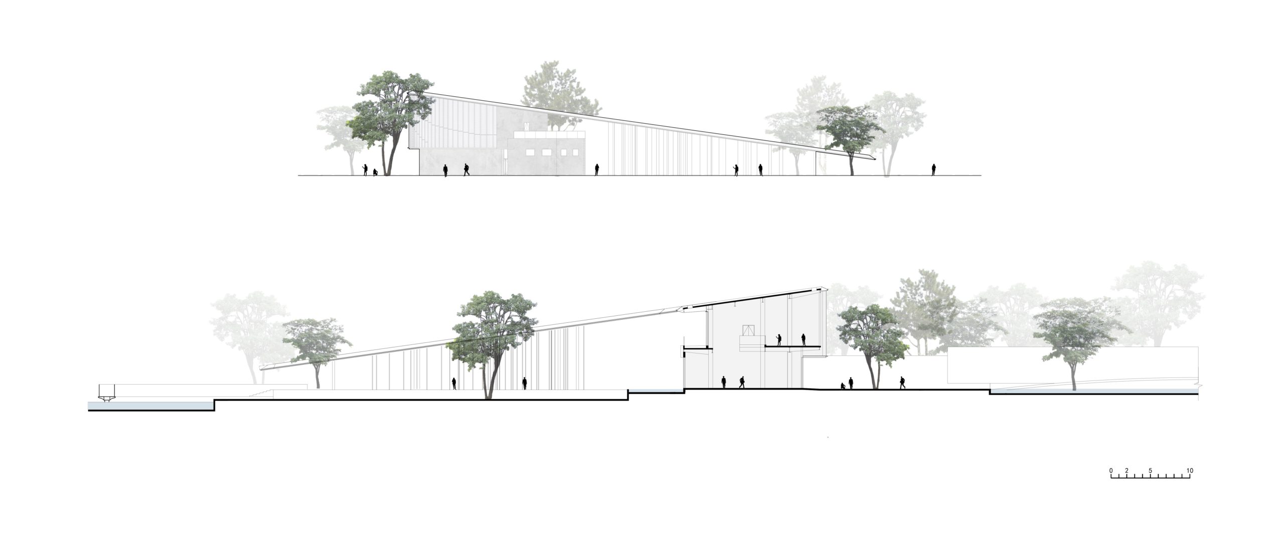 The internal area is organized around the curving wall. Irregular, high, and low interwoven arc-shaped walls support the entire building while connecting and dividing various functional rooms, expanding the layers of space and increasing spatial diversity. The translucent glass curtain wall opposite the lake allows visitors to detect seasonal changes. It blurs the line between the building and its environment, allowing them to engage with nature more effectively.