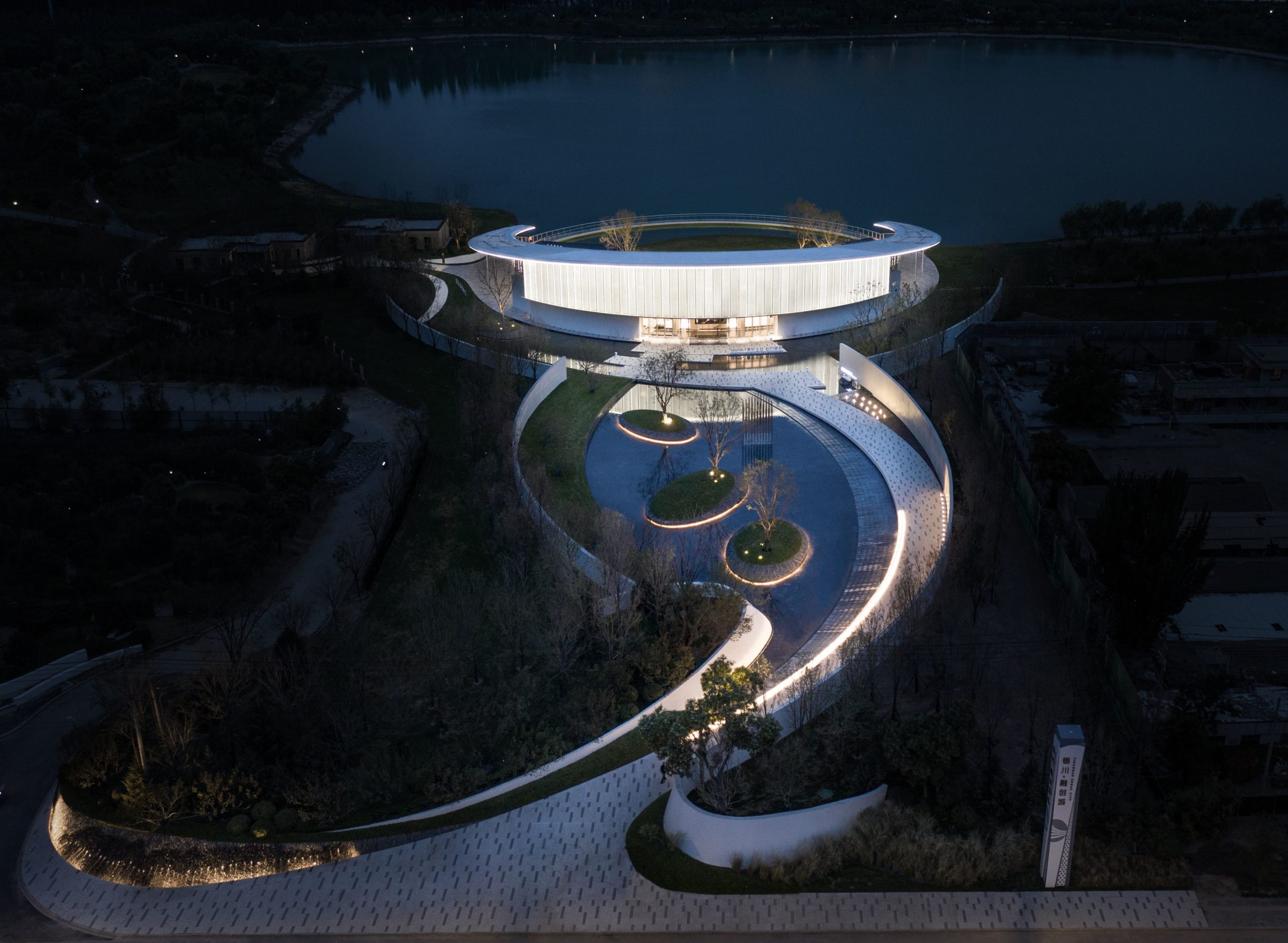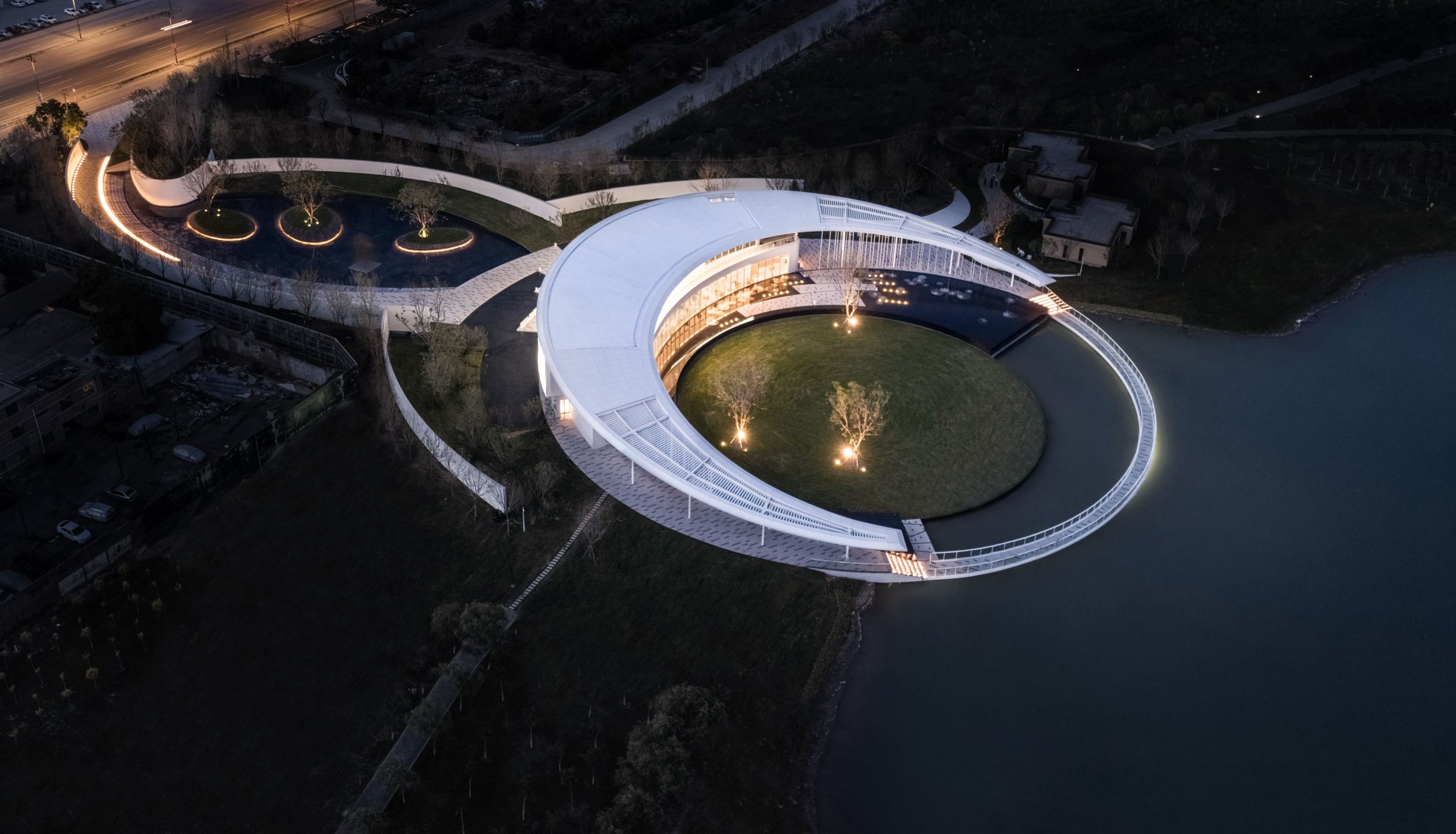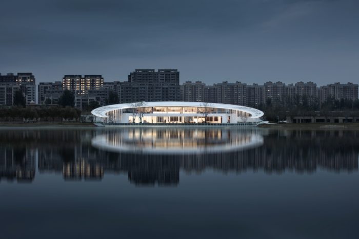 The structure is designed in a simple style. To embrace Gedi Lake naturally and attractively, the circular blocks and soft and clean curving features are merged into the field design, suggesting a thread of silk floating on the Lake. The half-moon-shaped roof slopes toward and reaches into the Lake. The perforated thin columns are neatly dispersed under the roof’s two wings. In the evening, the built-in light strips illuminate, giving the roof the appearance of being raised and hanging in the sky. The slab pontoon stretches into the Lake, linking humans and nature.