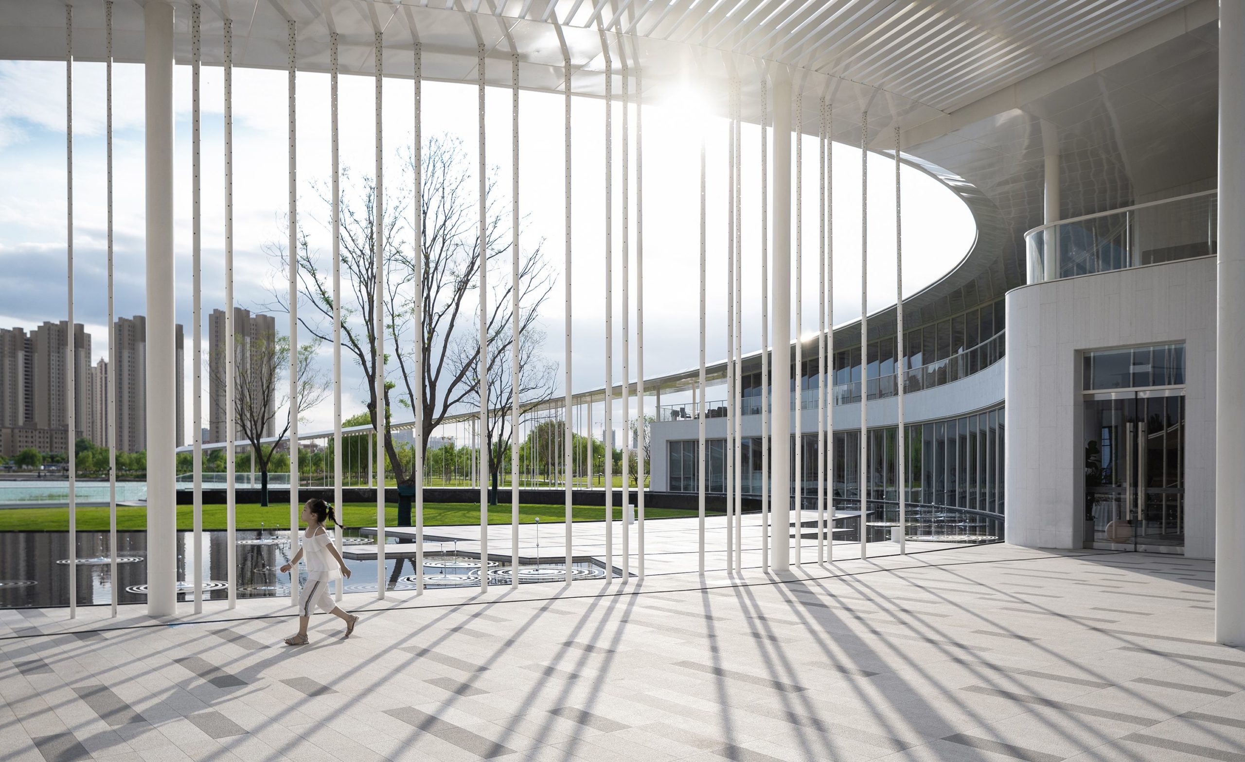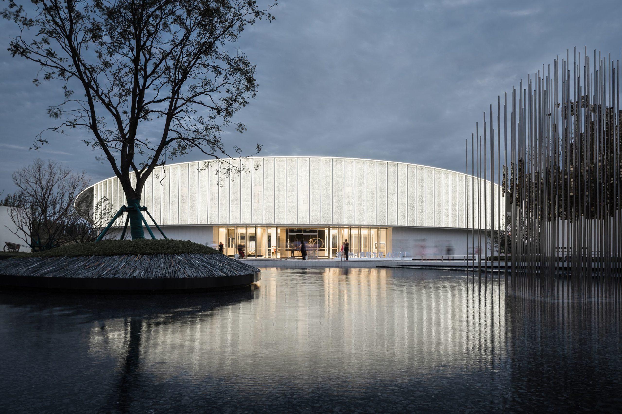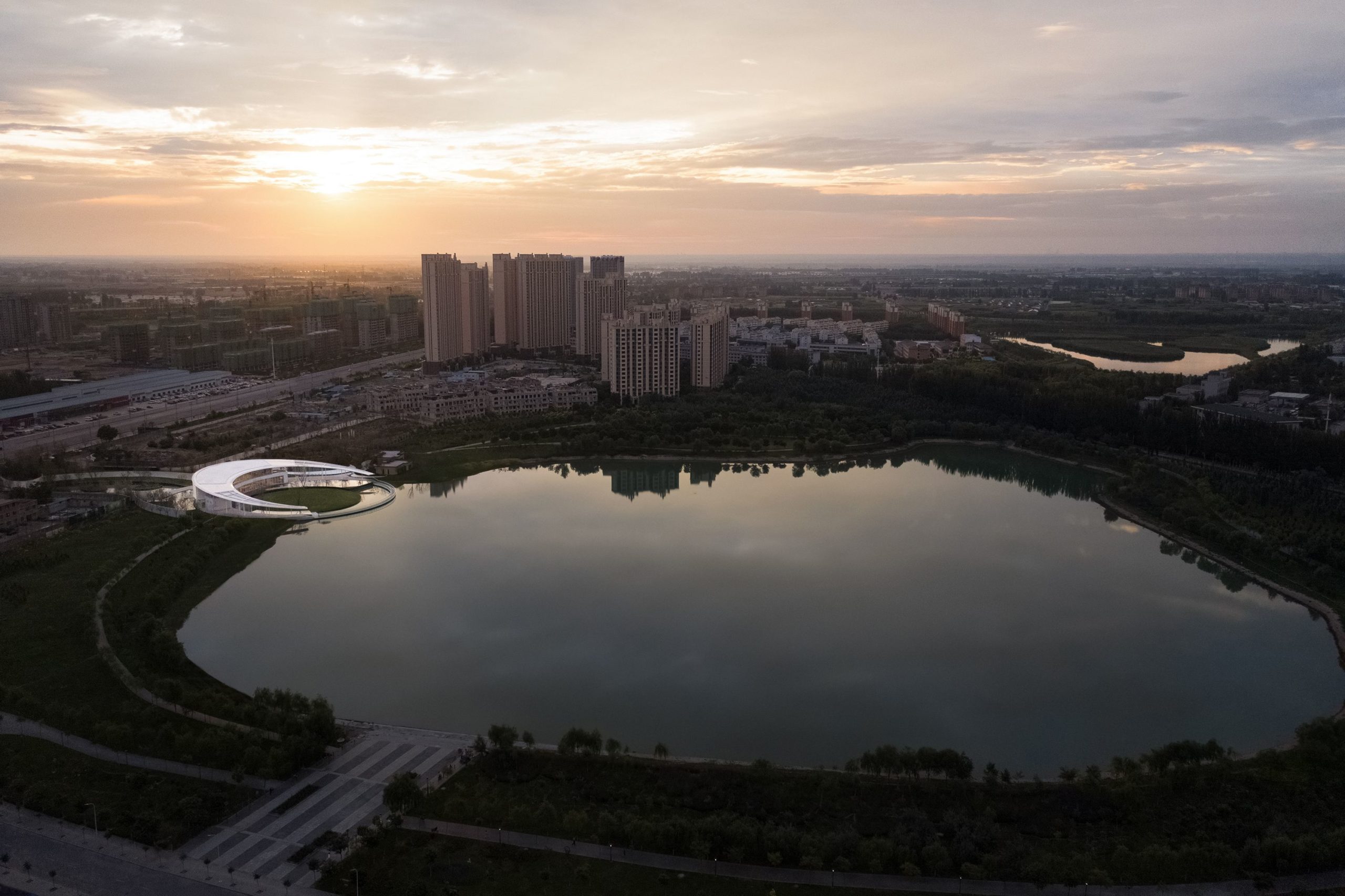 The structure is designed in a simple style. To embrace Gedi Lake naturally and attractively, the circular blocks and soft and clean curving features are merged into the field design, suggesting a thread of silk floating on the Lake. The half-moon-shaped roof slopes toward and reaches into the Lake. The perforated thin columns are neatly dispersed under the roof’s two wings. In the evening, the built-in light strips illuminate, giving the roof the appearance of being raised and hanging in the sky. The slab pontoon stretches into the Lake, linking humans and nature.