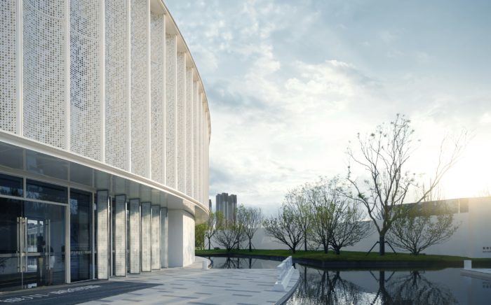 The fake stone wall on the first level correlates to the perforated panel curtain wall on the second story in terms of the urban facade, expressing the Oriental idea that “existence and non-existence give birth to the other.” The form of the hole on the perforated panel is created and inspired by Malan flowers, Yinchuan’s city flower. The panel splice creates two curving lines that imitate the waves of the Lake and add to the layers of light and shade. The translucent tempered hollow glass curtain wall and pear white roofing aluminum panels look crystal and lightweight while facing the Lake.