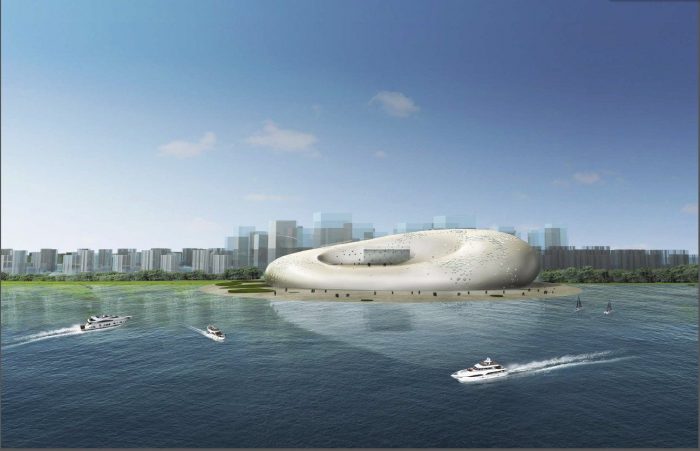 2DEFINE Architecture, the international firm who is best known for designing three of the world’s tallest buildings, has won another major design assignment. 2DEFINE Architecture has been selected to design the Yingkou Convention and Exposition Center, a US$68 million facility to be situated on a man-made island in the Bohai Sea, off the coast of the Chinese port city of Yingkou. The sea urchin-shaped facility will boast many green features, including a rain screen system on the roof that allows in natural light to minimize the need for artificial light. The four-story, 70,000-square-meter Center also will have a half-acre rooftop terrace, 25,000-square meter contiguous exhibtion hall, 5,100- square-meters of meeting rooms, two seafood restaurants, a 900-seat banquet hall, a 200-fixed seat auditorium, and outdoor garden and promenade spaces. With its 360-degree views, the oblong-shaped facility will provide excellent views. The Center will be the centerpiece of a new harbor created off of a satellite central business district in the port city. Yingkou is a fast-growing city of 2.4 million people located in the northeastern province of Liaoning. 2DEFINE will work on the project with the Dalian Urban Planning and Design Institute which will serve as national partner and be the architect of record. More details from the architect comes after the jump.