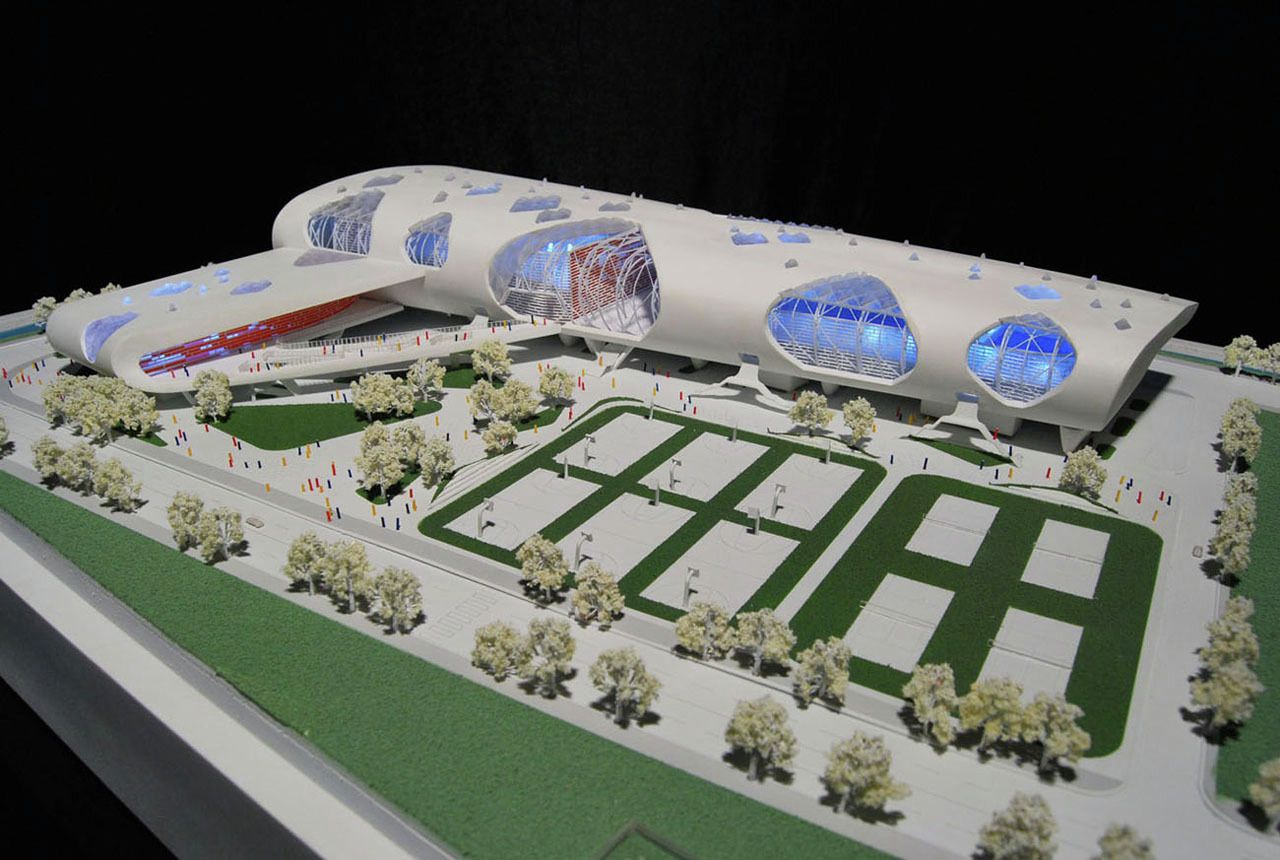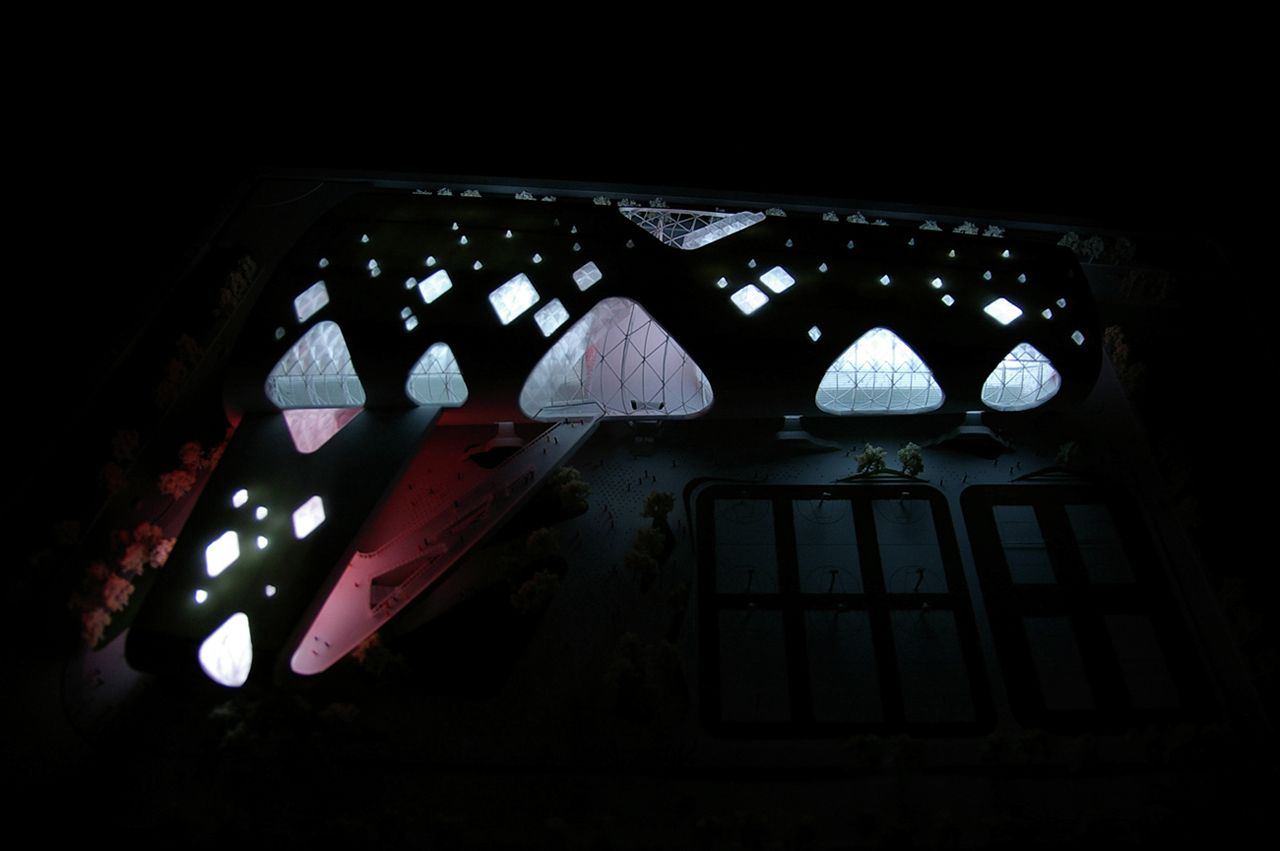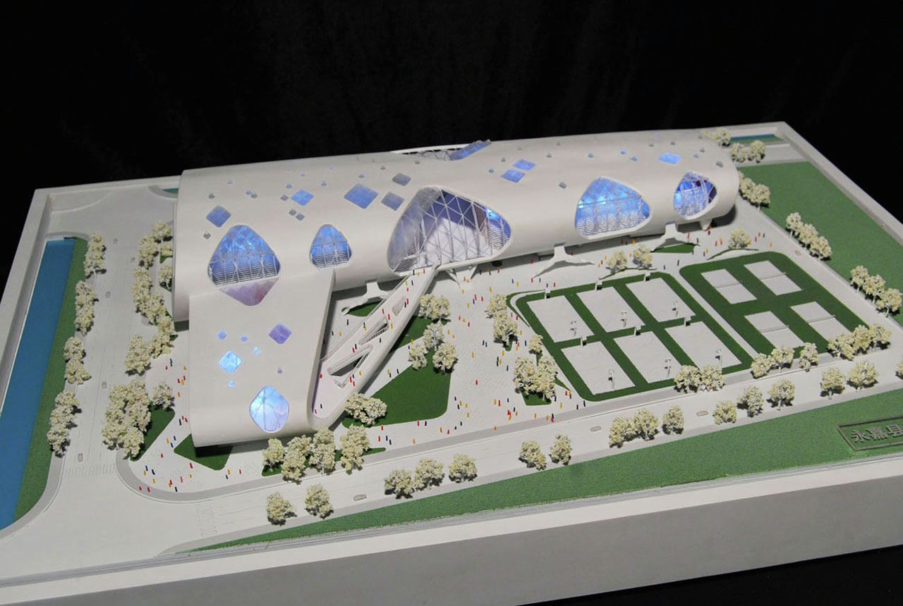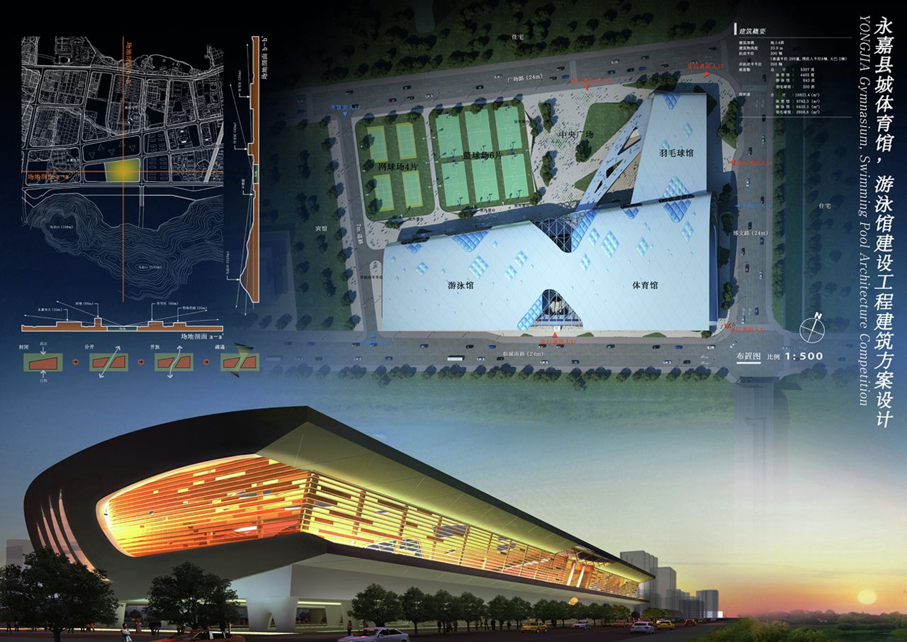 Vaguely remeniscent of Paul Andreu’s Roissy Airport in form, this smart looking building is Idea Image Institute Architect’s design for a new gymnasium in Yongjia, China.