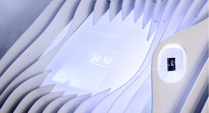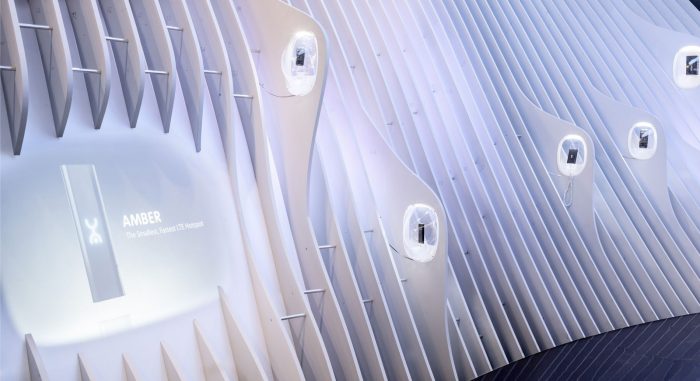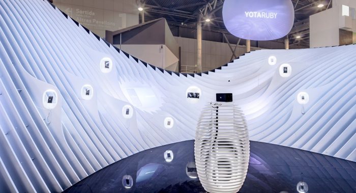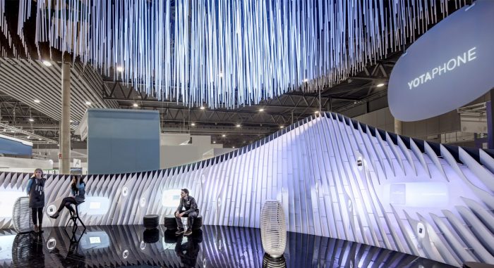 The Yota Devices Pavilion designed by External Reference Architects successfully creates an atmosphere that immediately engages visitors with intriguing technical application of the Yota Devices.