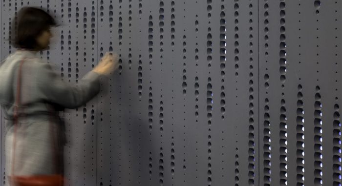 The technological landscape consists of  two contrasting natures; the first being a sequence of transparent, sleek, tactile ribbons that encompass the general functionality of the Pavilion. The ribbons also transform the space, altering in size, increasing  and enclosing on specific devices or either decreasing in size to combine with projected spaces.