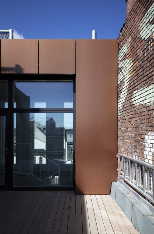 On the 6th floor, the roof terrace incorporates the difference in height between the surrounding buildings, and provide the inhabitants with a private outdoor space. At the ground floor, a public bike repair shop opens up the building towards the street and the social connection is further enhanced by areas for a stay near the entrance.