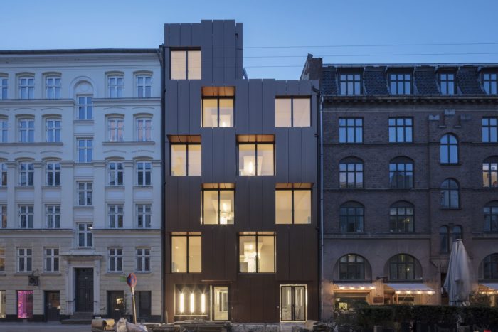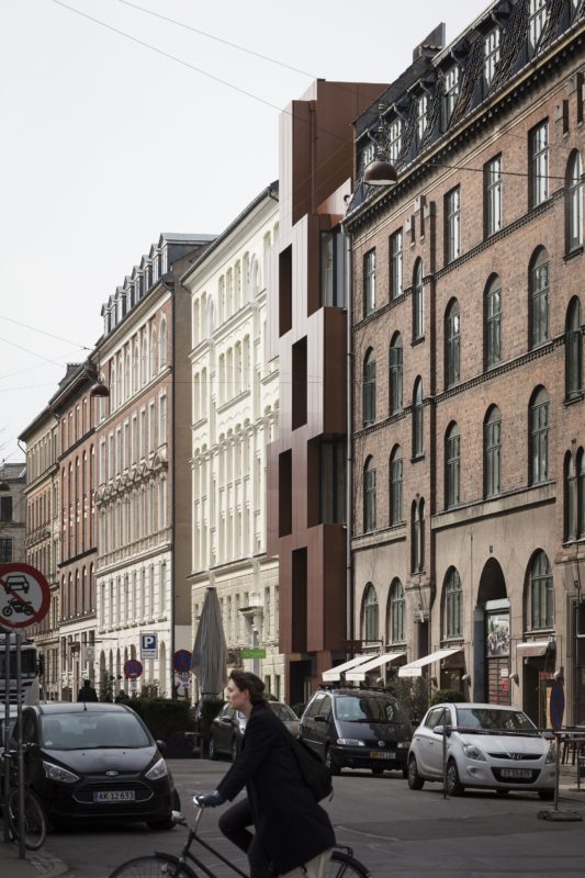 Youth Housing, Nansensgade designed by Christensen & Co. Architects, The compact infill holds nine small apartments for socially vulnerable citizens. The building site is only 10 meters wide, this physical limitation of the architecture is turned into a design quality, as only two apartments to each floor give the young inhabitants a sense of privacy, while also giving them the security of being part of a community. Each apartment has its own kitchen and a bathroom along with a niche for relaxing while enjoying the view of one of Copenhagen’s most vibrant streets. Outside, the facade is clad in coppery warm toned aluminum and has a relief motive; apart from creating variation and vibrancy in the urban environment, the protruding bay windows offer views down the street from each apartment niche.