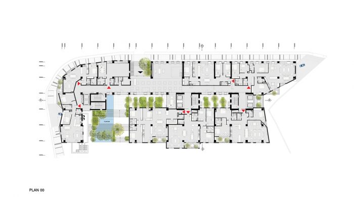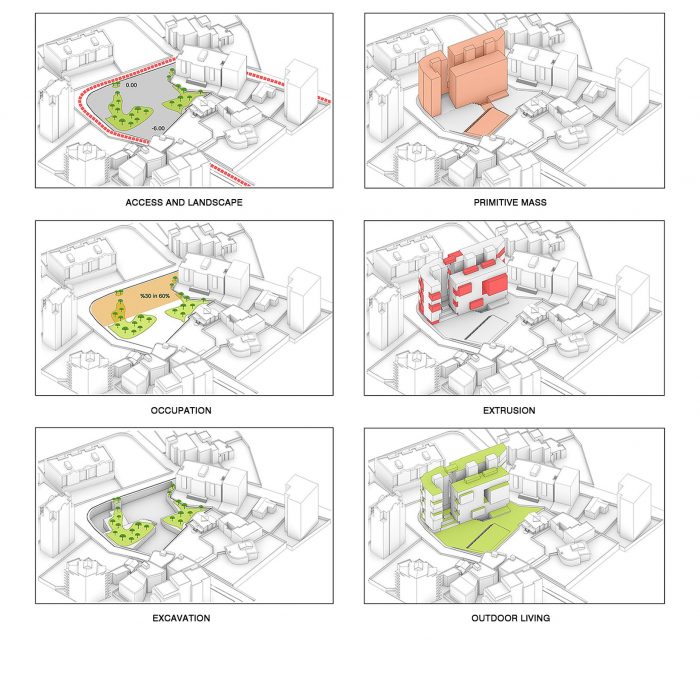The concept of plant boxes as a representation of the interacting city life and nature was envisioned to sculpt the mass volume. Recycling of rainwater trough made us able to use it for Irrigation and flush tanks –using a gray piping system. This way we developed a big number of trees on balconies with a minimum height of 2floors and outdoor living surfaces.