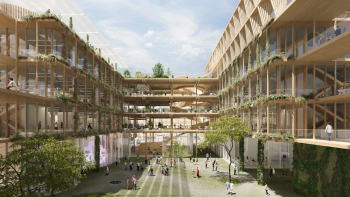The design consists of two “net-positive” mass timber buildings linked by a central courtyard. The more extensive structure, a seven-story “wet lab,” will occupy the Institut de Biologia Evolutiva’s offices. In contrast, the smaller five-story “dry lab” will house a variety of group work for Barcelona’s Universitat Pompeu Fabra. More than 452,000 square feet of interior space will be available from the buildings when they are united.