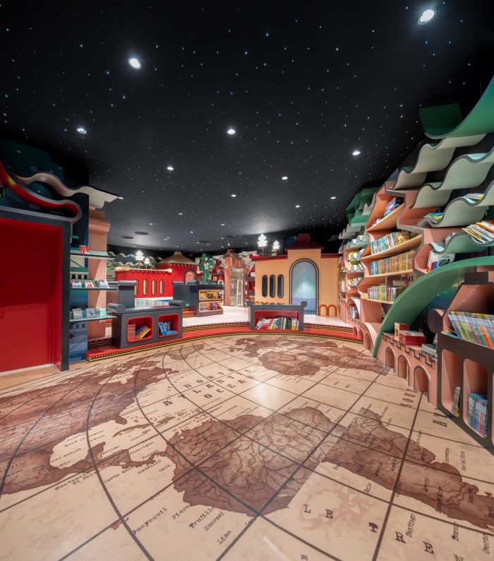 Behind the door where you find a bamboo forest is the cultural and creative area. The extremely simplified wood branches, through the skillful arrangement, have completed the turn from microscopic image to macroscopic view. A line has been drawn between two wooden branches, and a special poster or book display booth is formed, which fully satisfies the owners’ diversified operation needs. The straight-line action path of readers is decomposed, and the ease of walking in bamboo groves is a delicate mood experience that designers present to readers.