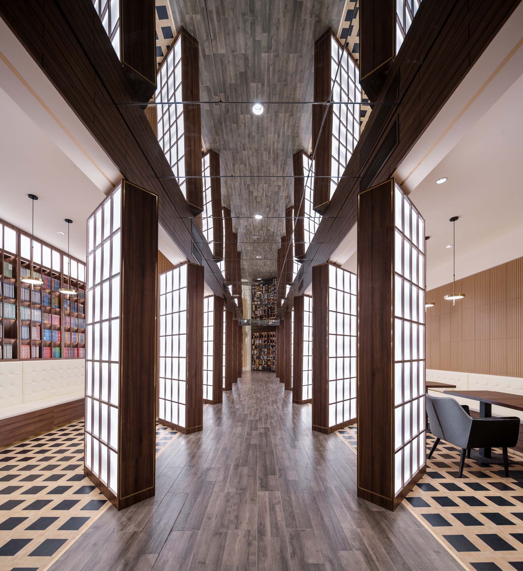Through the bamboo grove and walking into the study hall, the designer created a ceremonial and secluded elegant atmosphere by using the central symmetrical layout of traditional architecture. The bookshelf is inspired from screen art, on the back of which is the lamp box acting as a light source. The warm glowfrom the paper pane fell on the face of the reader, creating an antique flavour.