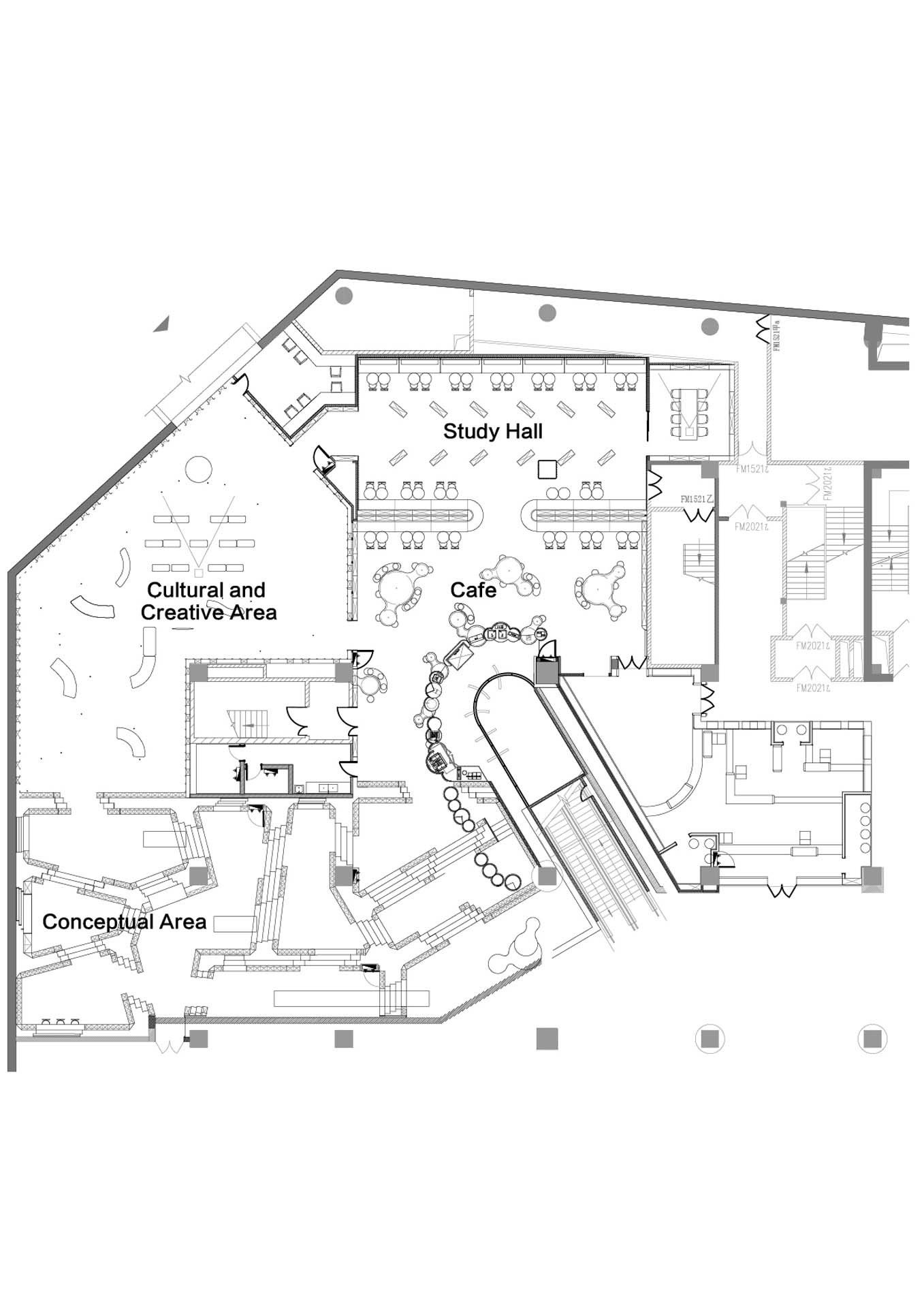 The cashier constructed by terrazzo material are the same with those in the cafe.The arrangement of tables and chairs in the cafe is distributed casually but ingreat order, simulating a gathering of ancient people in a famous Chinese painting called “Qu Shui Liu Shang”. The shared tables and chairs enable the crowd to sit next to different social needs and constitute the elegant and interesting scene together.