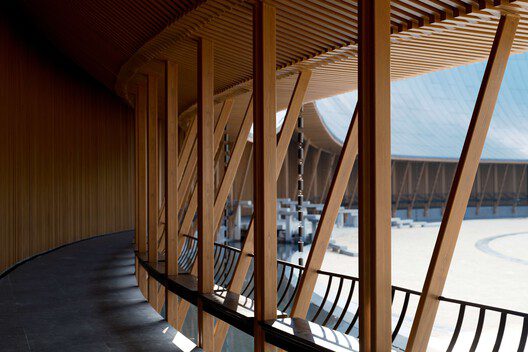 The main challenge was adapting the oversized building, originally designed as a hotel, to better fit the scale and atmosphere of the thousand-year-old water town. The design not only needed to respond to cultural symbolism, but also incorporate practical performance logistics like audience circulation and equipment access.Rather than covering the building in traditional motifs, we introduced The Curtain—a concept that works both visually and metaphorically. Two curved, curtain-like aluminum panels gently mask the original form, creating a light, open impression. The lifted entrance hints at theatrical anticipation, while the dark corridor behind forms a silhouette reminiscent of traditional Chinese gabled roofs—offering a cultural anchor to the modern intervention.