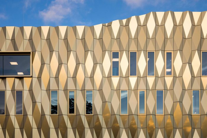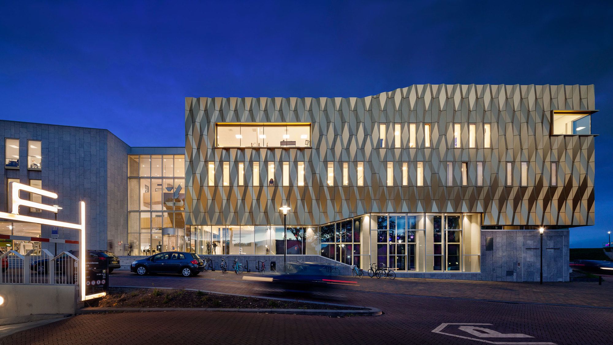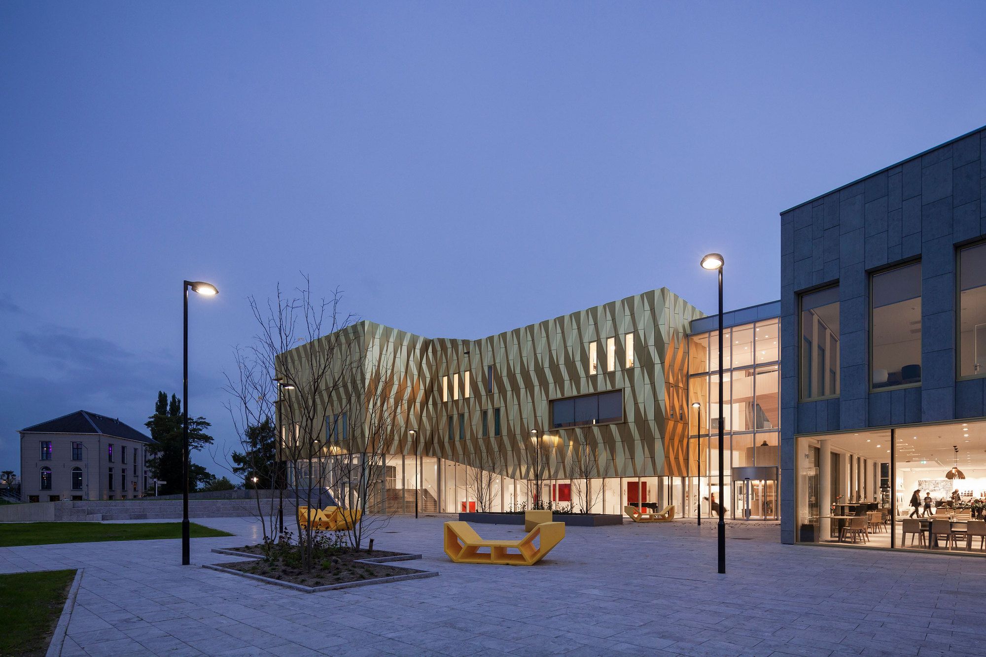 Visitors to Zinder, but also to the adjacent Agnietenhof Theatre & Film Theatre and the city center, can park here. Zinder Education, the center for the arts, is housed in the “golden lantern” which floats as it were above the culture podium. Next, to it, there is a robust, natural stone volume where the library is located. While Zinder Education is a prominent landmark in Tiel, the library seeks more connection with the historic city center. The central entrance hall forms the link between the two volumes. Here visitors meet and inspire each other. The multi-functional hall that lies sunken beneath the lantern accommodates 320 people. The remarkable façade of Zinder Education comprises faceted aluminum elements, anodized with a golden color.