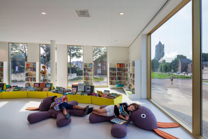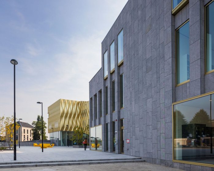 Together, the folded panels form an origami pattern presenting a constantly varying image to the inhabitants of Tiel, depending on the perspective, weather conditions and time of day. The large windows provide a view of what is happening in the building. From the street, you catch a glimpse of the dancers rehearsing, see sculpture students at work, and your attention is drawn to a concert in the multi-functional hall. The stone façade of the library is chiseled, whereby the solid volume becomes livelier and lighter and stands out from the podium constructed from flame-finished, natural stone. The façades have story-high glass strips that guarantee maximum contact between interior and exterior. Here, too, the large windows reveal what is happening inside the building. By designing the window frames in gold aluminum as well, it all becomes part of the “golden lantern” family.