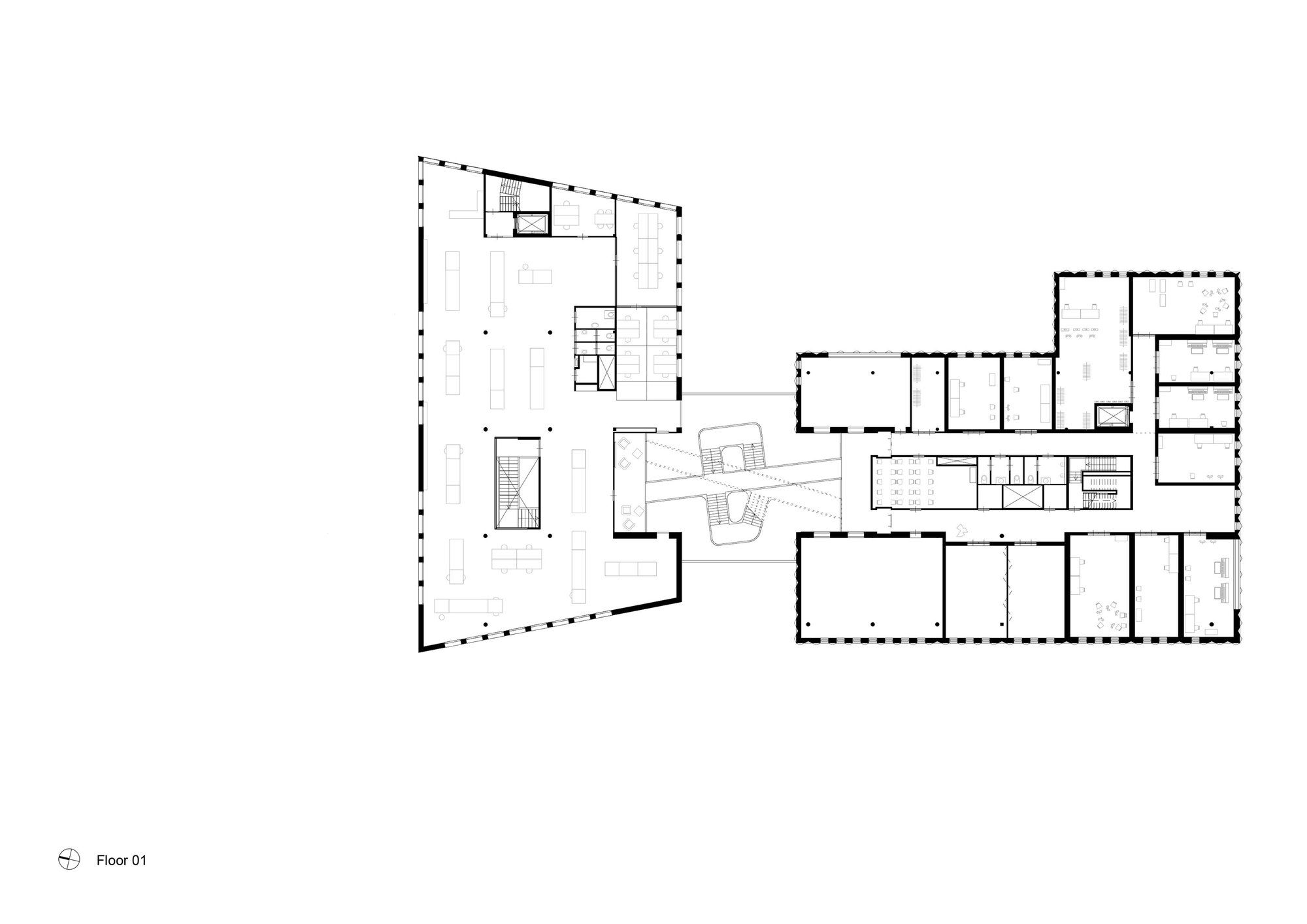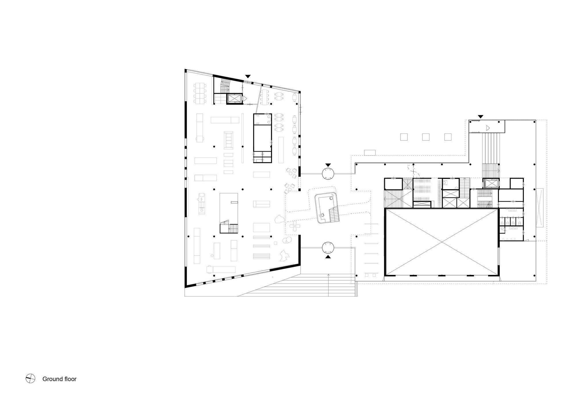to the central hall that spans the entire height of the building. This is where all the users of the culture cluster converge. The library has an open connection to the hall and there is a cafe directly next to the main entrance. The art library displays its latest acquisitions here, and the tourist information desk and the Tiel archive have their counters here. The sculptural staircase is the eye-catcher providing access to the studios, classrooms, and offices on the various floors. The multi-functional hall is also accessed via the central hall, so that it can also serve as an exhibition space, for example. When used in the evening as a pop music venue the hall has a separate entrance via the plaza.
