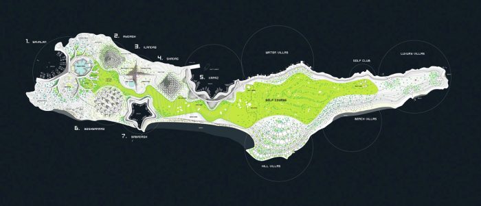 high-density urban areas in the western part of the island to the villas areas in the eastern part. The neighborhoods are tied together by the central public park that leads to the centrally located main beach. The easternmost tip of the island is the location of three grand luxury villas with private beaches and heliport.