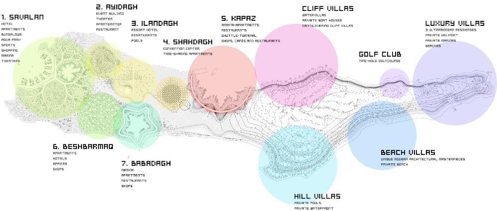 The master plan is conceived as a series of neighborhoods along the coastline, ranging from